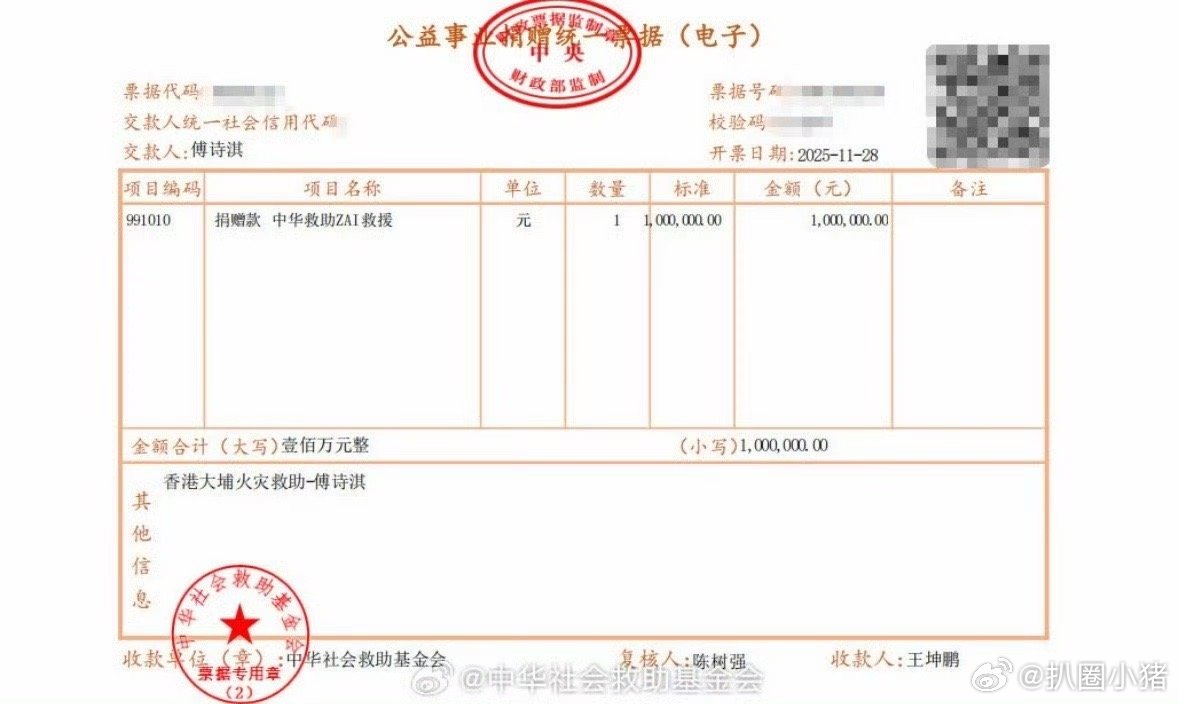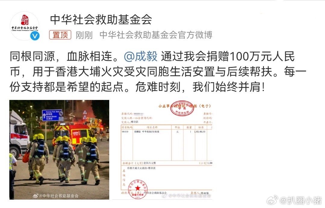 成毅向香港捐赠100万元人民币,用于香港大埔火灾受灾同胞生活安置与后续帮扶,危难时刻,始终并肩,愿同胞平安🙏