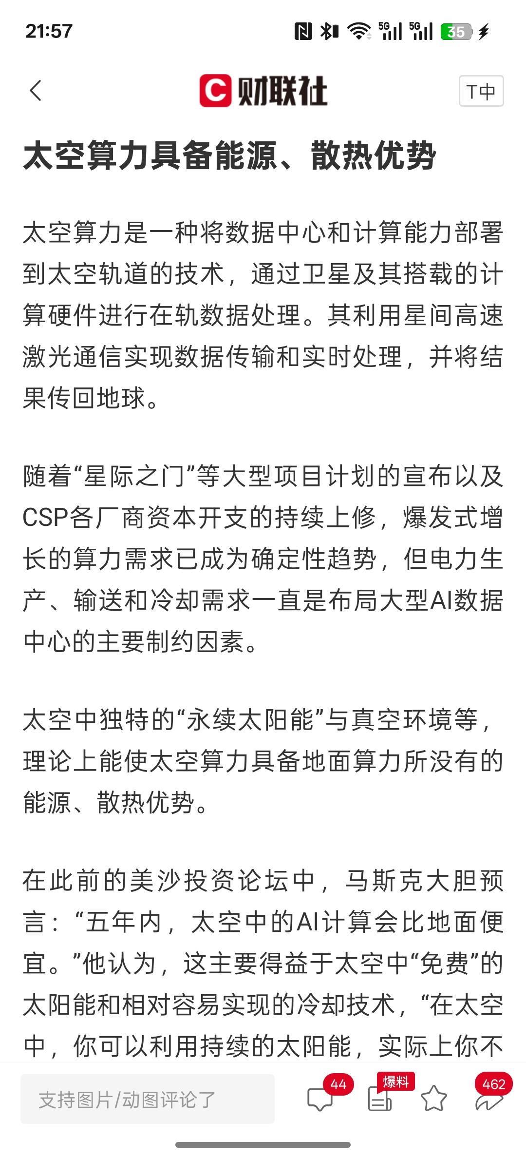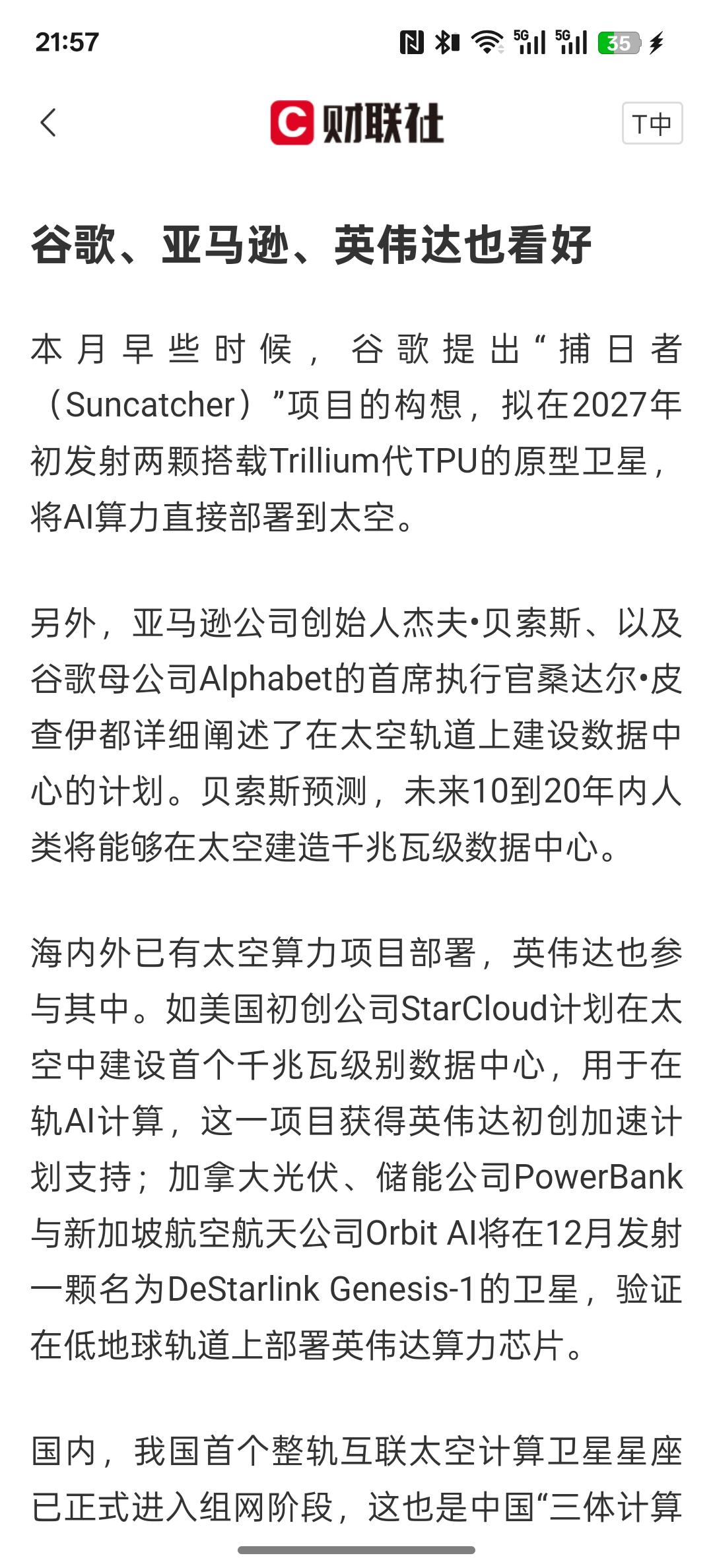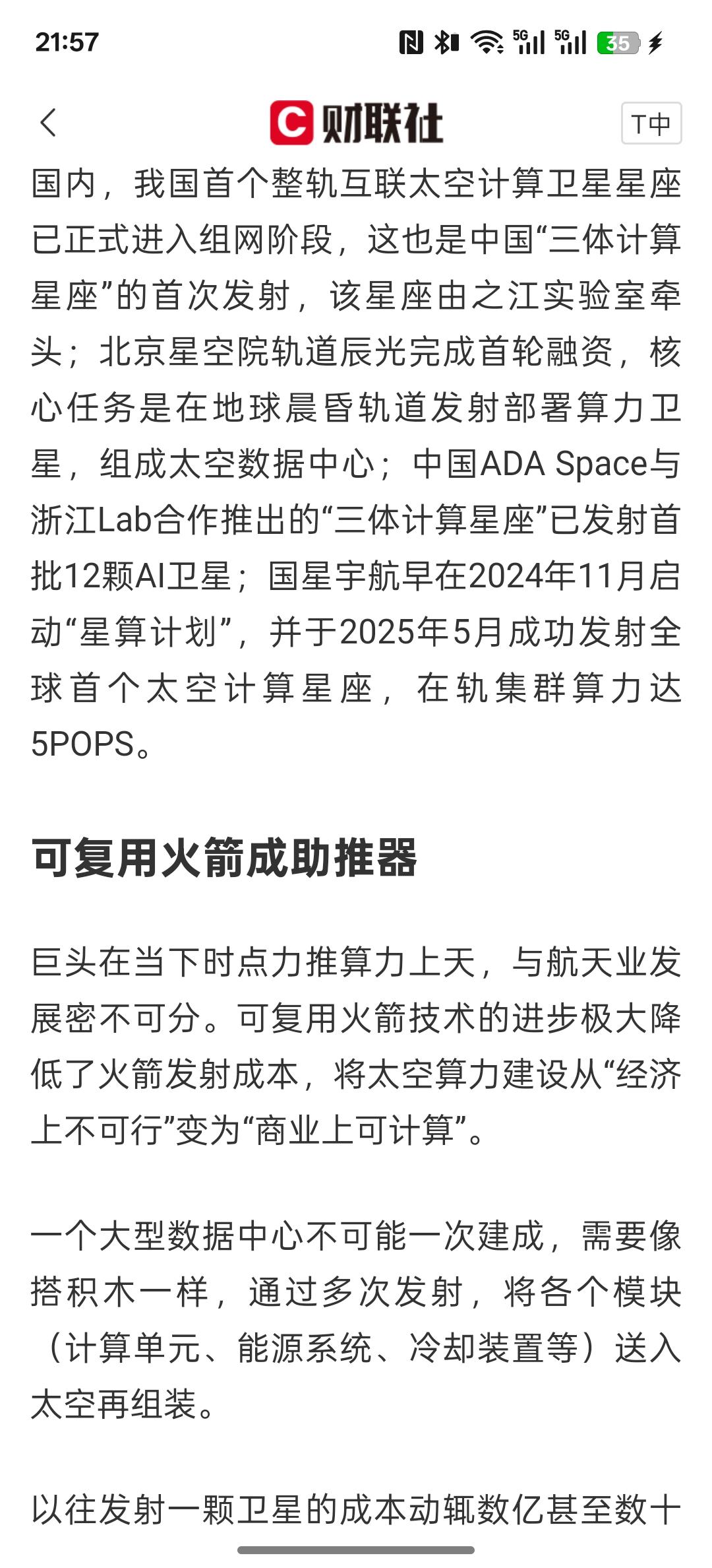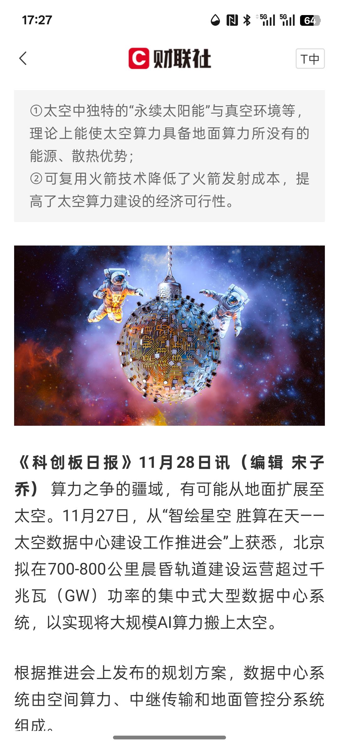 利好消息,数据中心建设转战太空?北京提出算力上天 航天开启新叙事,中国确实有加速布局太空数据中心,将大规模的AI算力搬上太空,至少在太空有足够的能源支持,而不需要冷却系统!会大量的降低算力成本以及数据中心建设的成本。未来,中国会加速这一方面的发展,毕竟AI人工智能的发展需要更多的算力与数据中心的建设。太空确实是更好的一个发展的地方!我们的太空网络也正在建设! 中国到2030年后就应该是可以大规模建成数据中心的组网建设!到哪个时候,中国的算力以及超算能力在全球应该算是非常领先的地位!这一场AA人工智能的发展,中国确实拥有了很强的技术积累!