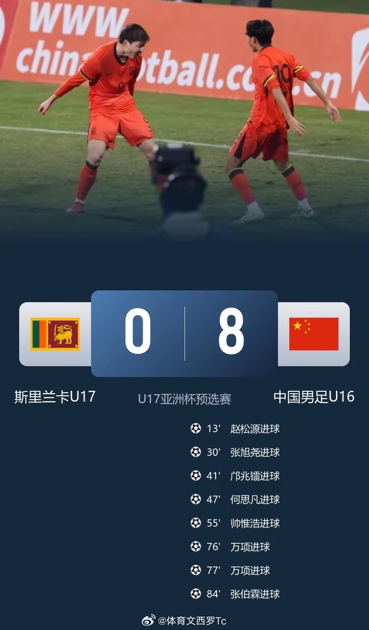 U16国足8-0斯里兰卡末轮与孟加拉国争出线权 万项双响赵松源传射足球体育 11月28日讯 北京时间11月28日19:35,U17亚洲杯预选赛A组第4轮,U16国足在铜梁龙体育场迎战斯里兰卡U16。上半场,赵松源破门3场10球,张旭尧再下一城,邝兆镭建功;下半场,何思凡破门,他随后助攻帅惟浩,万项替补2分钟双响,张伯霖头球建功。最终,国少队8-0斯里兰卡队,4连胜轰38球0丢球领跑,他们末轮将与同样4战全胜的孟加拉国争夺出线权。