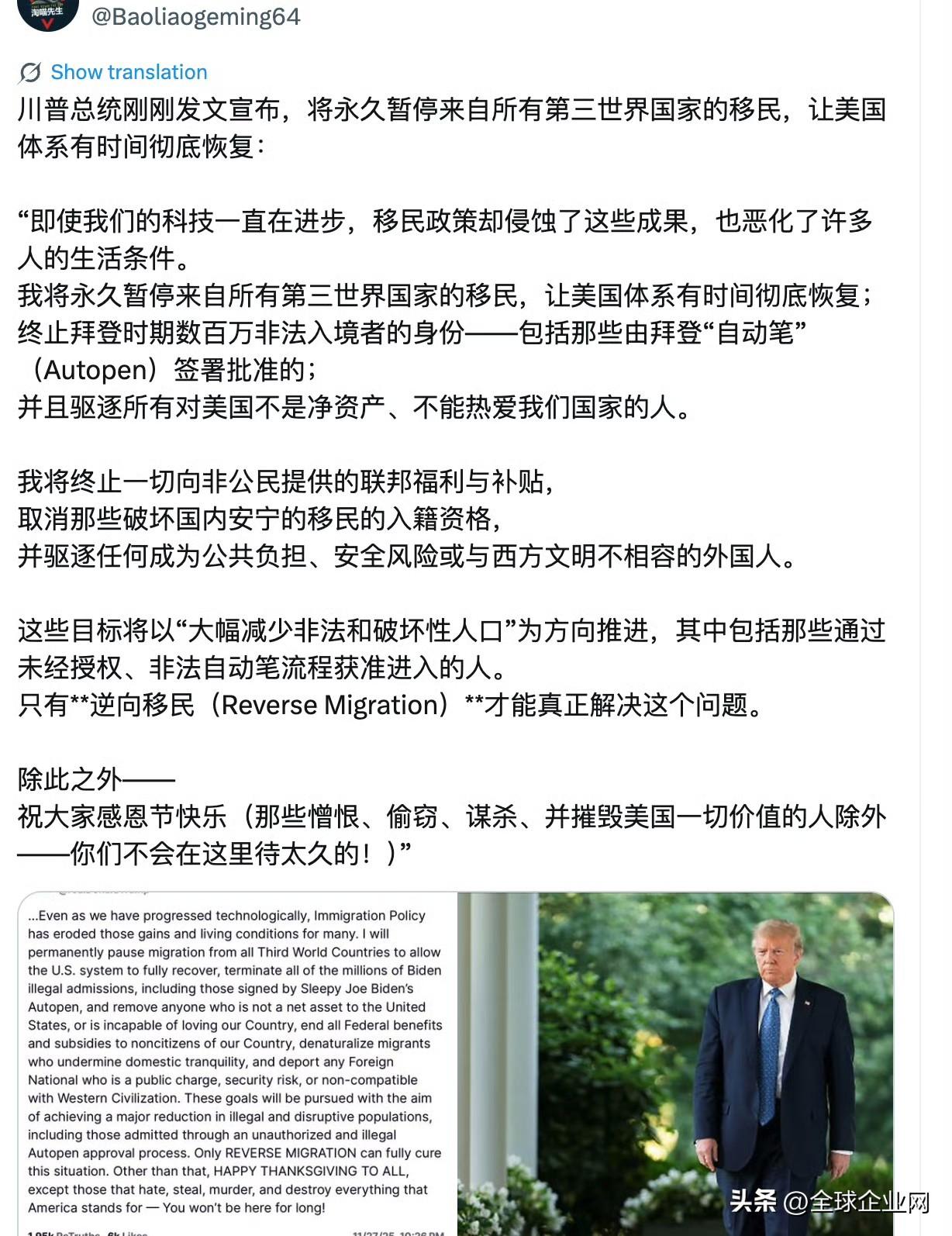川普在感恩节晚间宣布,将永久暂停来自所有第三世界国家的移民,让美国体系彻底恢复;终止拜登时期非法入境者身份,并强调“驱逐所有对美国不是净资产、不能热爱我们国家的人”;提出“逆向移民”(reverse migration)概念——大规模遣返那些被视为“福利负担”或来自“监狱、精神病院、帮派或贩毒集团”的人。 目前,美国外国人口据称达5300万,其中多数“依赖福利”。 民主党、移民权益团体和NBC等媒体猛烈抨击川普,说这是“反移民咆哮”和“集体惩罚”,指其种族歧视、违宪,并污名化整个社区。阿富汗社区领袖警告,此类事件不应代表全体……预计法律挑战将蜂拥而至…… 这时机挑得太精准了。 感恩节当晚,全美最温馨的时刻,家家户户围着火鸡、土豆泥、南瓜派…… 左翼正准备感恩“多元”,他直接扔一炸弹——永久暂停第三世界移民+逆向大遣返。 这是存心让民主党过不好这个节。