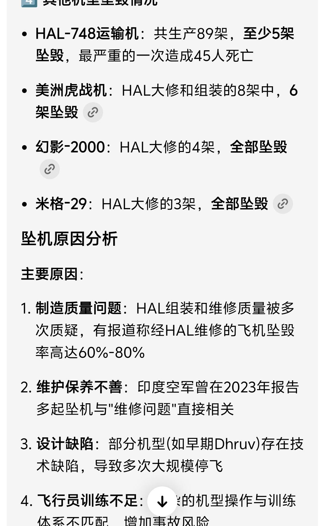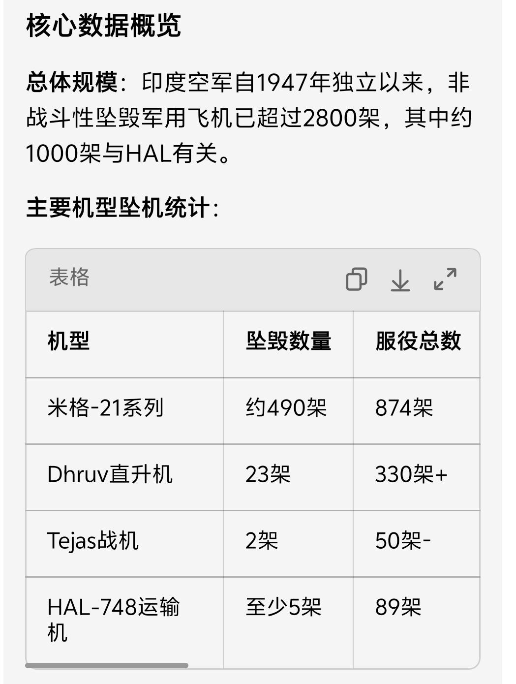 印度斯坦航空董事长近日出面宣称:“光辉战机毫无问题,此前仅坠毁一架,这属于意外情况,光辉战机仍是世界上最安全的飞机。”好家伙,印度从上到总统,下到普通百姓,口径竟惊人地一致。 倘若飞机本身没问题,那问题是否就出在印度斯坦航空身上了呢?毕竟这家航空公司可是声名远扬,经其组装或维修的飞机,坠毁概率高达80%,堪称“寡妇制造者”。 印度斯坦航空累计造成约1000架飞机坠毁,其中米格-21占近一半,直升机和其他机型也有相当数量的损失。这一惊人数字使HAL成为印度空军最大的"隐形敌人",甚至超过了任何敌对国家击落的印度飞机数量。印度坠毁事故 印度航空坠机 印度航空坠毁 印度坠毁飞机