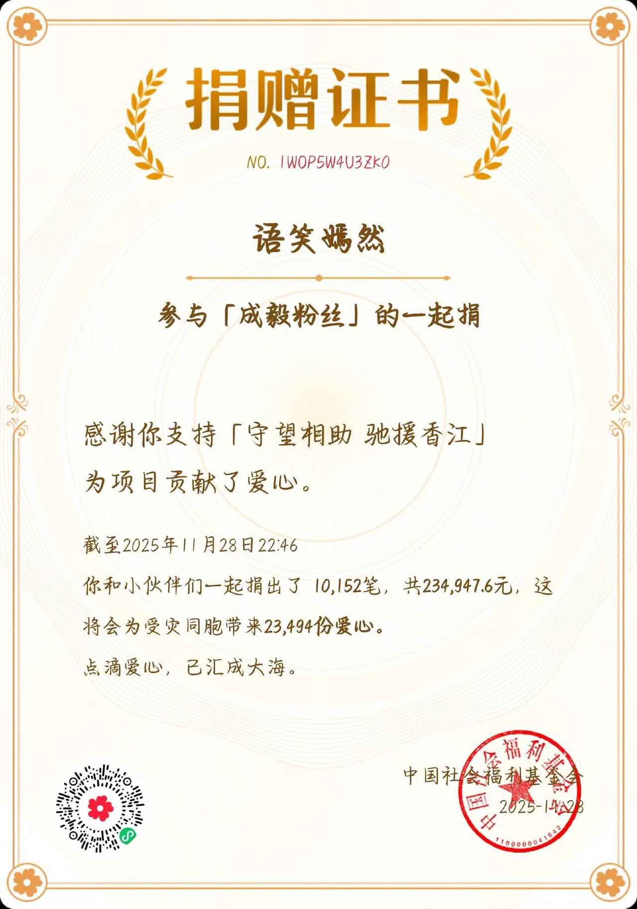 成毅粉丝尽微薄之力共度难关。愿伤者早日康复,家园尽快恢复安宁,香港加油