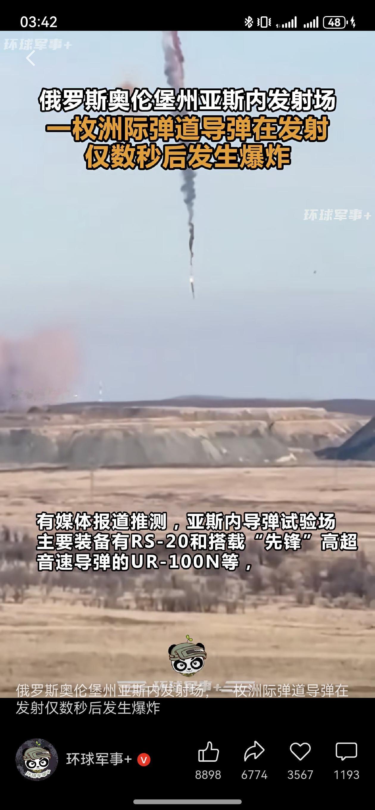 俄罗斯一枚洲际导弹发射失败并坠落爆炸。