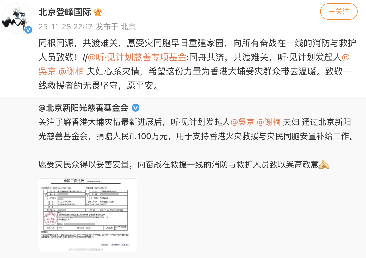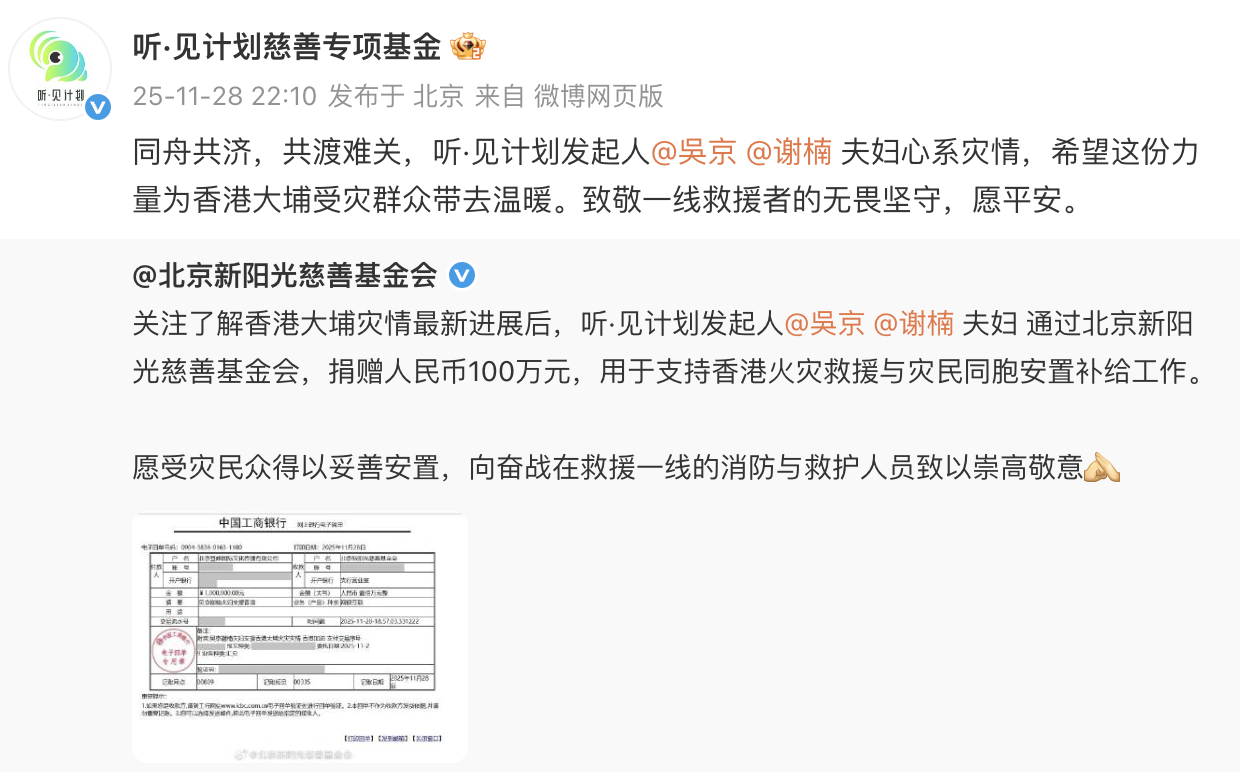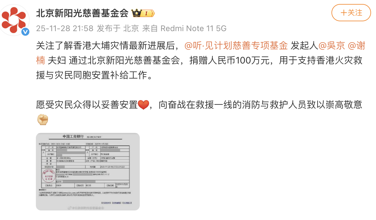 吴京谢楠捐款香港100万吴京谢楠向香港捐款100万元香港大埔火灾牵动人心,听·见计划发起人吴京谢楠火速行动,通过北京新阳光慈善基金会捐100万元,助力救援与灾民安置,手足情深尽显担当。