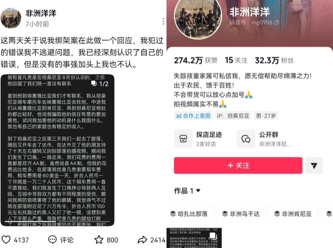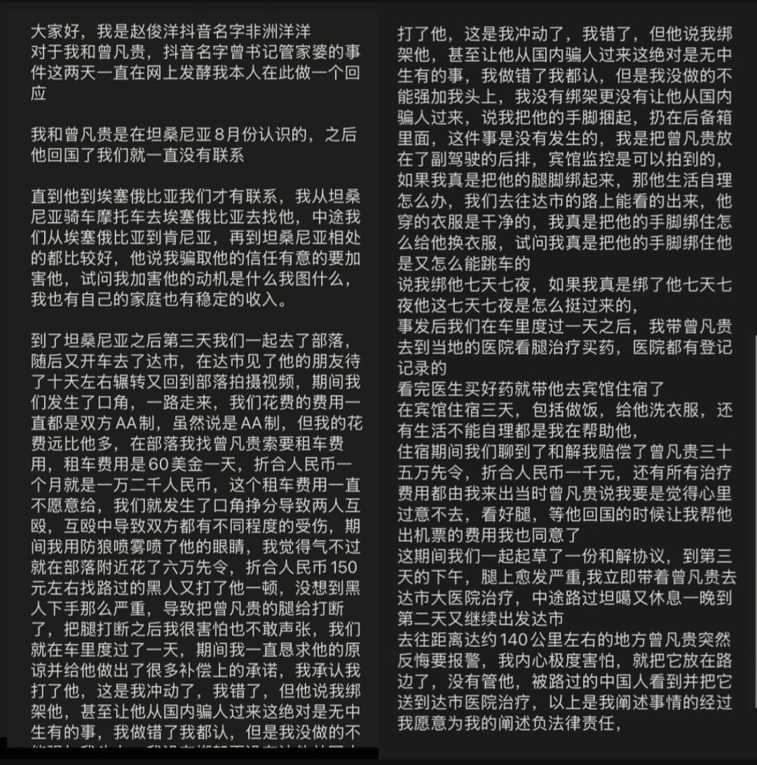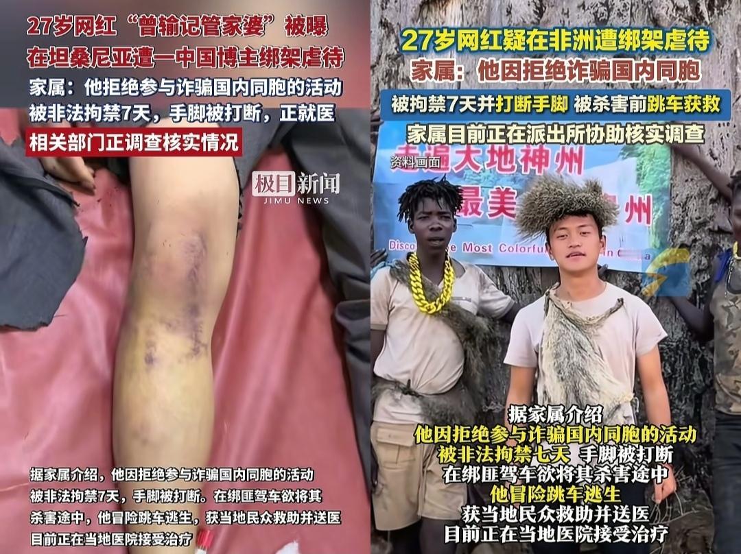 近日27岁中国自媒体博主曾先生,网名‘曾输记管家婆’在坦桑尼亚遭绑架虐待的消息引发全网关注!抖音账号非洲洋洋回应了这件事,双方因为租车费用产生争执,他承认了用防狼喷雾喷对方眼睛、花钱雇黑人殴打对方,最终导致曾凡贵腿被打断,否认绑架,只是将曾凡贵放在副驾后排,后面带去就医、安排住宿。 曾凡贵的说法是拒绝参与诈骗,后续被绑架欲杀害跳车逃生。 赵俊洋的说法是租车费纠纷,后续带其治疗、协商赔偿,因对方反悔报警才将其放下。 曾凡贵的说法指向绑架、非法拘禁、故意杀人未遂,属于严重刑事犯罪。 赵俊洋的说法试图将事件弱化到民事纠纷引发的故意伤害,降低法律责任。 目前双方各执一词,案件正在调查中,相信司法机关会以事实为依据、以法律为准绳,给出公平公正的裁决。
