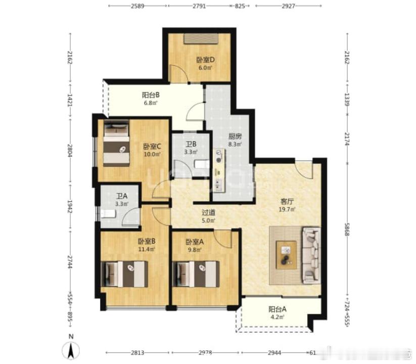 佳兆业城市广场朝南的经典户型,相当于3房+保姆房。