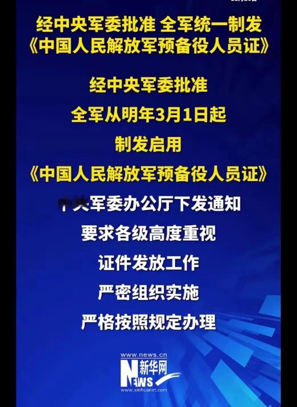 经中央军委批准,全军从明年3月1日起制发启用 《中国人民解放军预备役人员证》,中央军委这一决定,是未雨绸缪还是一则硬招? 中央军委这次的新决定,无疑是在提前布局、稳固国家安全体系的一盘大棋。大家都说“未雨绸缪”,这可不是一句空话,而是一次对未来可能风险的科学预判和有力应对。历史一次又一次证明,备战早、准备足,才能在关键时刻立于不败之地。中国作为世界大国,面对复杂多变的国际局势,“不惧打仗、善于打仗”从来都是军队的根本要求,而这次制度落地,正是落实这一理念的现实行动。 许多读者也关心新颁布的《中华人民共和国预备役人员法》到底意味着什么?没错,这不是简单的号召,更是一套完整的法律保障和操作规范。虽说有年龄限制,比如你提到的超过预备役年龄门槛,暂时与预备役无缘,但这就是制度的刚性,是保障体系健康运转的关键。能上的人该上,按照流程登记、训练,做到信息透明、心中有底,这样才能消除误解和恐慌。毕竟,备战不仅是军队的事情,是全民的责任。 也许有人担忧生活被牵动,担心投入训练影响工作家庭,但从另一个角度看,这正是国家安全赖以坚固的基石。做好应急准备,是对家人、对社会的负责。没有人希望突发事件成为灾难,而有准备的人,才能最大程度保护自己和家人。这既是一份责任,更是一份荣耀。 社会舆论中,难免有质疑和担忧,但最关键的是要依法依规,理性看待,不被谣言和无端猜测影响。这份法律和制度的出台,是中央军委对新时代安全形势的深刻洞察和冷静应对。我们普通群众也应以积极的心态参与其中,配合政策,主动了解,既守法又助力国家安全建设。 那么,面对这份制度,你准备好了吗?有没有打算去了解自己是否符合条件,积极参与预备役?还是觉得这离自己太远?欢迎评论区畅所欲言,吐槽、分享你的看法和故事。毕竟,国家的安全和个人的生活紧密相连,每一个人的态度都至关重要!