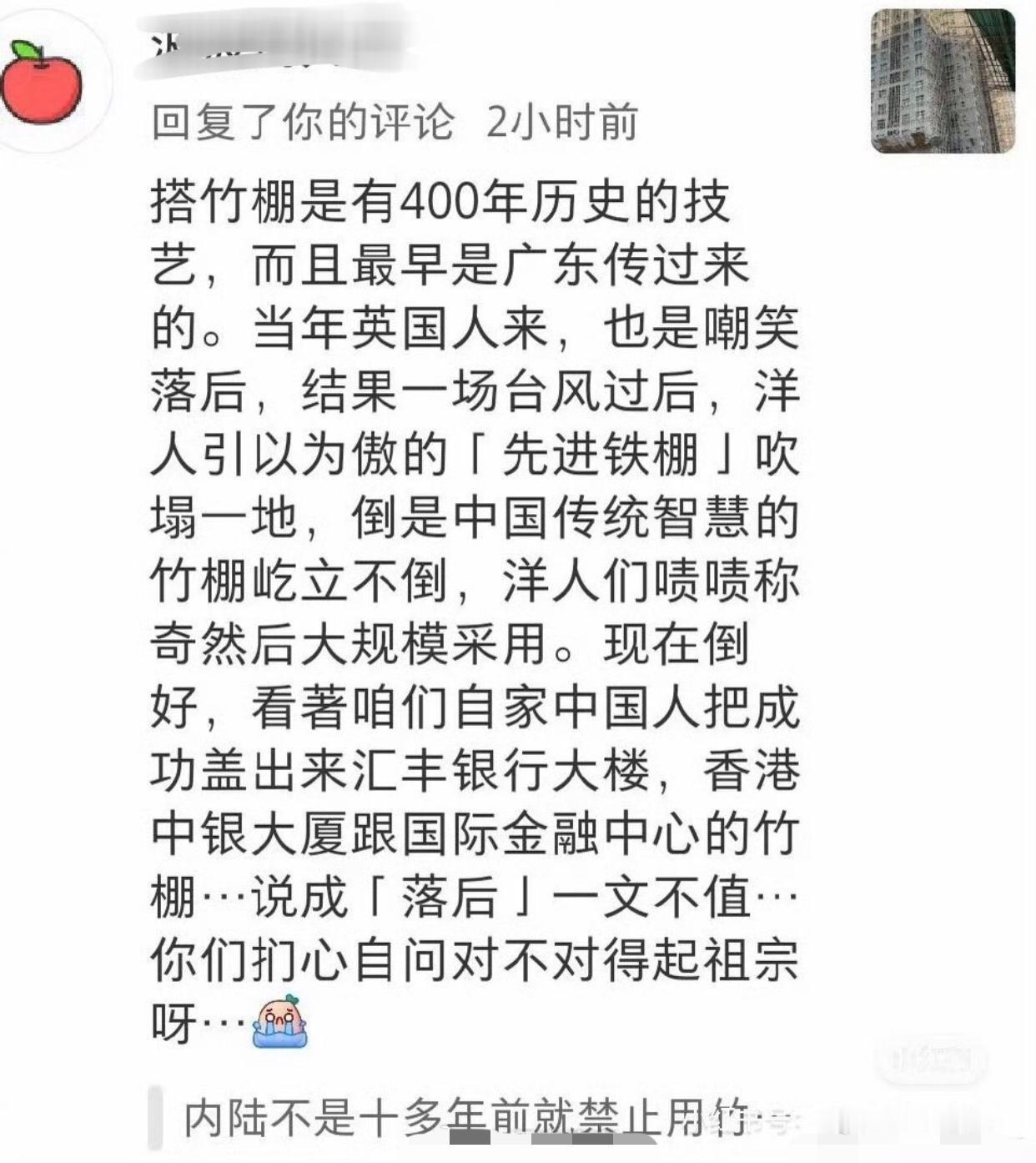 网友:弃用竹棚,对不起祖宗,搭竹棚是中国的传统技艺,带有中国智慧,至今已有400年历史,香港的搭竹棚技艺来自广东,当年英国人还嘲笑这项技艺落后,结果一场台风过后,洋人引以为傲的“先进铁棚”被吹倒一大片,而竹棚却屹立不倒,洋人感到惊奇后也大规模采用竹棚来在香港盖出众多摩天大楼。但是现在香港的搭竹棚技艺被说成“落后”,并被贬得一文不值,你们扪心自问对得起老祖宗吗?!