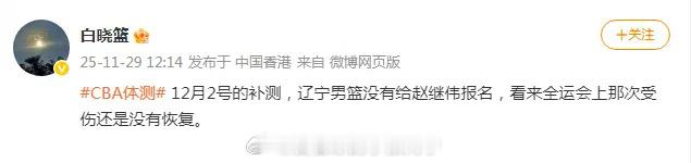赵继伟未报名首次补测:将无缘杯赛小组赛 新赛季至少缺席前5轮北京时间11月29日,赵继伟工作室官方晒出赵继伟的训练视频,但根据媒体人白晓篮报道,辽宁男篮并未给赵继伟报名12月2日的首次体测补测。如此一来,赵继伟将无缘CBA俱乐部杯的小组赛,也将无缘CBA新赛季至少前5轮比赛。在此前的全运会男篮半决赛,赵继伟左侧大腿肌肉拉伤,他提前退赛被送往医院治疗,成为辽宁全运男篮被广东全运男篮淘汰的重要因素,无缘冲击全运会3连冠。赵继伟之后还因伤缺席全运会男篮决赛,辽宁全运男篮输给四川全运男篮仅获得第四名,无缘登上全运会领奖台。根据辽宁男篮此前官方通报的赵继伟伤病情况,他是遭遇左侧大腿后侧肌肉拉伤。所幸,赵继伟的伤情目前来看是轻度拉伤,毕竟他已经开始进行恢复训练,而重度拉伤则是需要手术,且至少缺席3个月比赛。赵继伟因伤缺席了新赛季的CBA体测,且为了保险起见,根据媒体人白晓篮报道:“12月2号的补测,辽宁男篮没有给赵继伟报名,看来全运会上那次受伤还是没有恢复。”由于赵继伟并未报名第一次补测,因此他将缺席12月3日-8日的CBA俱乐部杯小组赛。至于第二次补测是在常规赛第五轮结束后到第六轮开赛前,换言之赵继伟也将至少缺席新赛季的前5轮常规赛。至于第3次补测是常规赛第十轮结束后到第十一轮开赛前,而球员完成首次测试及三次补测成绩仍未达标者,新赛季不再安排补测,将停赛至常规赛第十五轮(含第十五轮)。