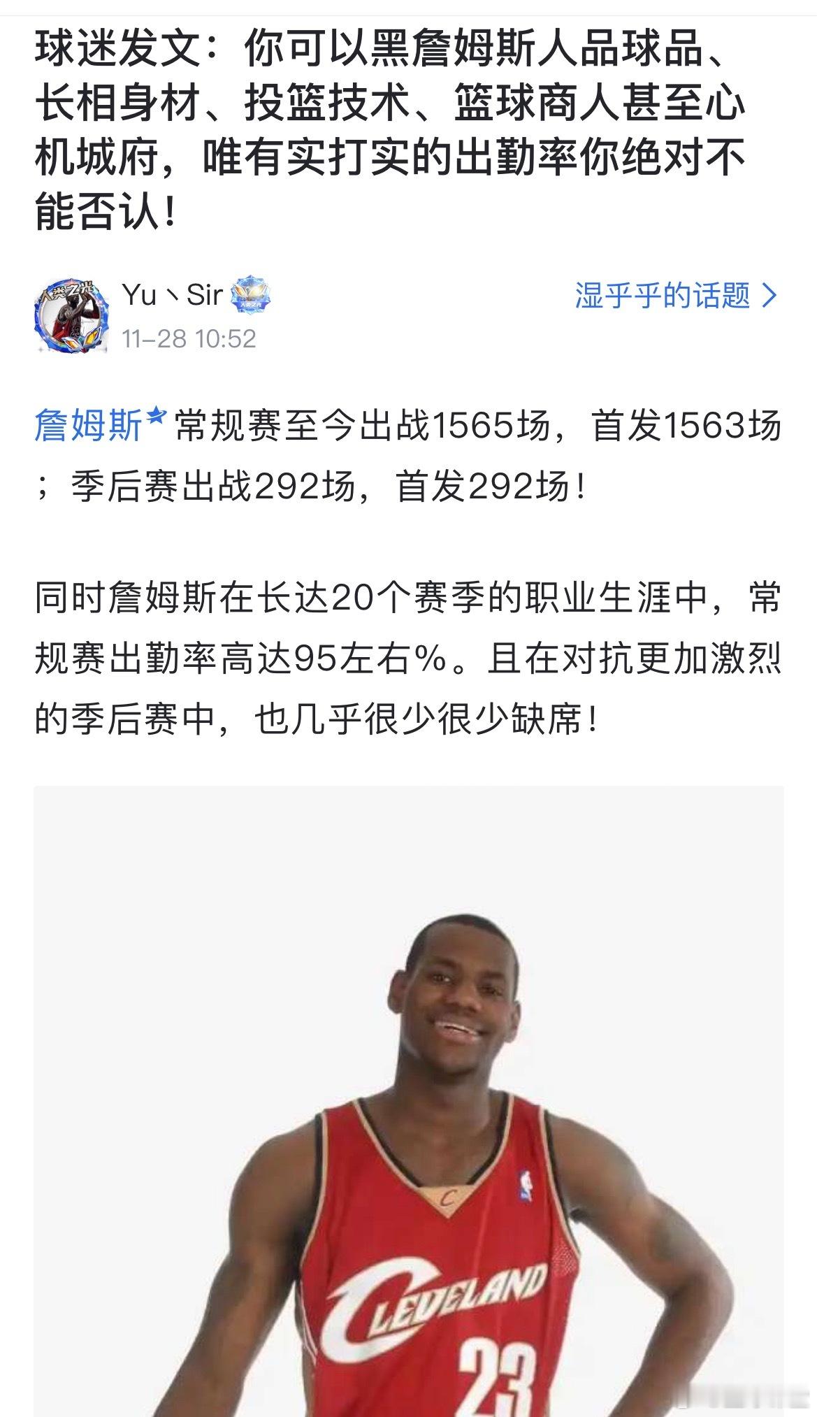 球迷发文:你可以黑詹姆斯人品球品、长相身材、投篮技术、篮球商人甚至心机城府,唯有实打实的出勤率你绝对不能否认!