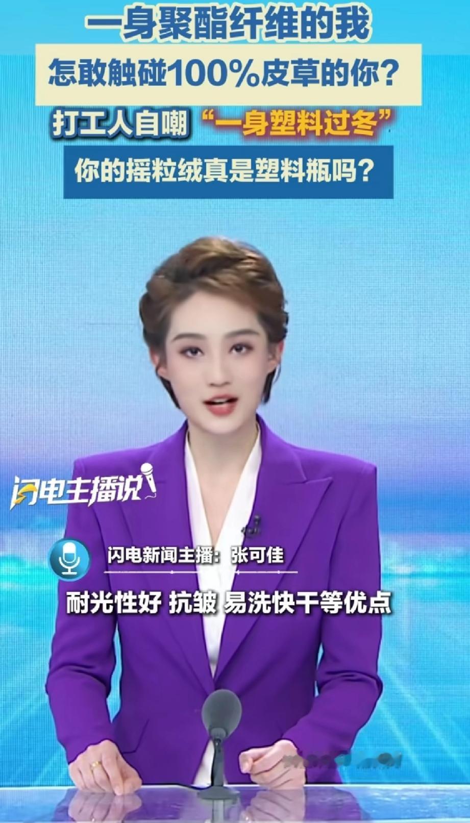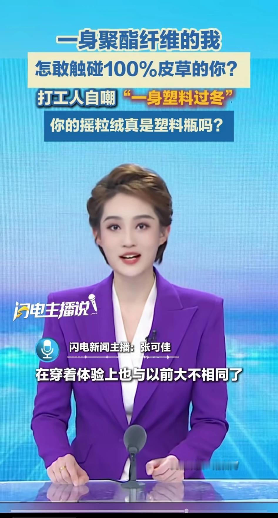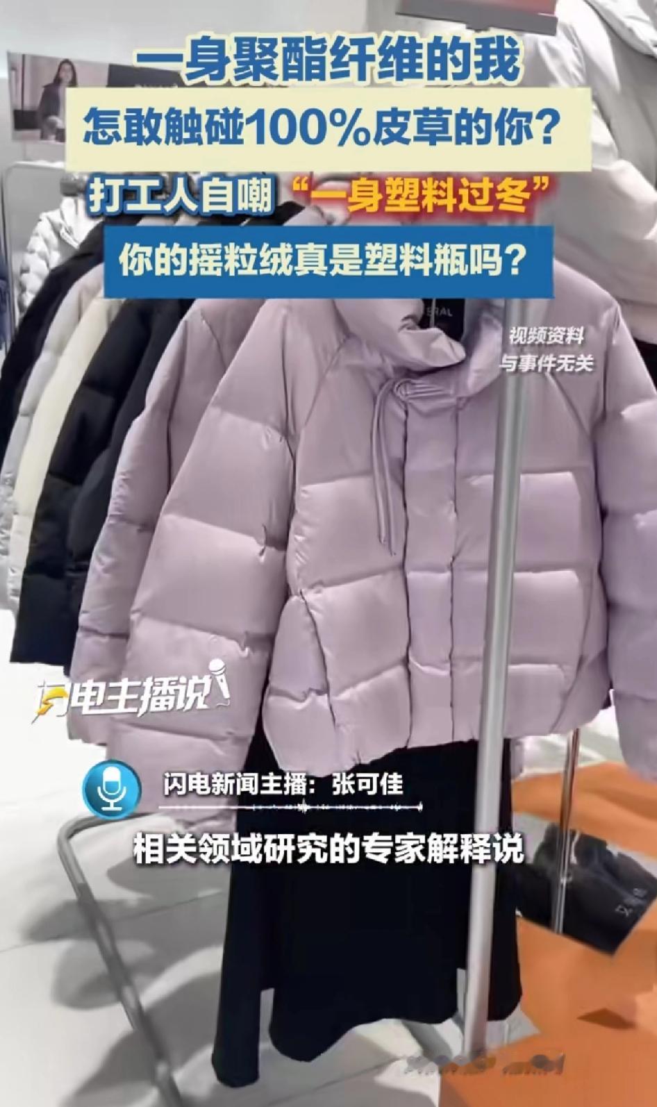 打工人自嘲“一身塑料过冬”一身聚酯纤维的我怎敢触碰100%皮草的你。你的摇粒绒是真塑料吗? 这话还真有道理。看看衣柜里的冬装,羽绒服、摇粒绒外套,水洗标上大多都有聚酯纤维。 走在大街上就是被一堆压缩塑料瓶子包裹在身上。 美其名曰:耐磨性好、回弹力好、抗皱、易洗一系列优点…… 就是不说啪啪的静电。