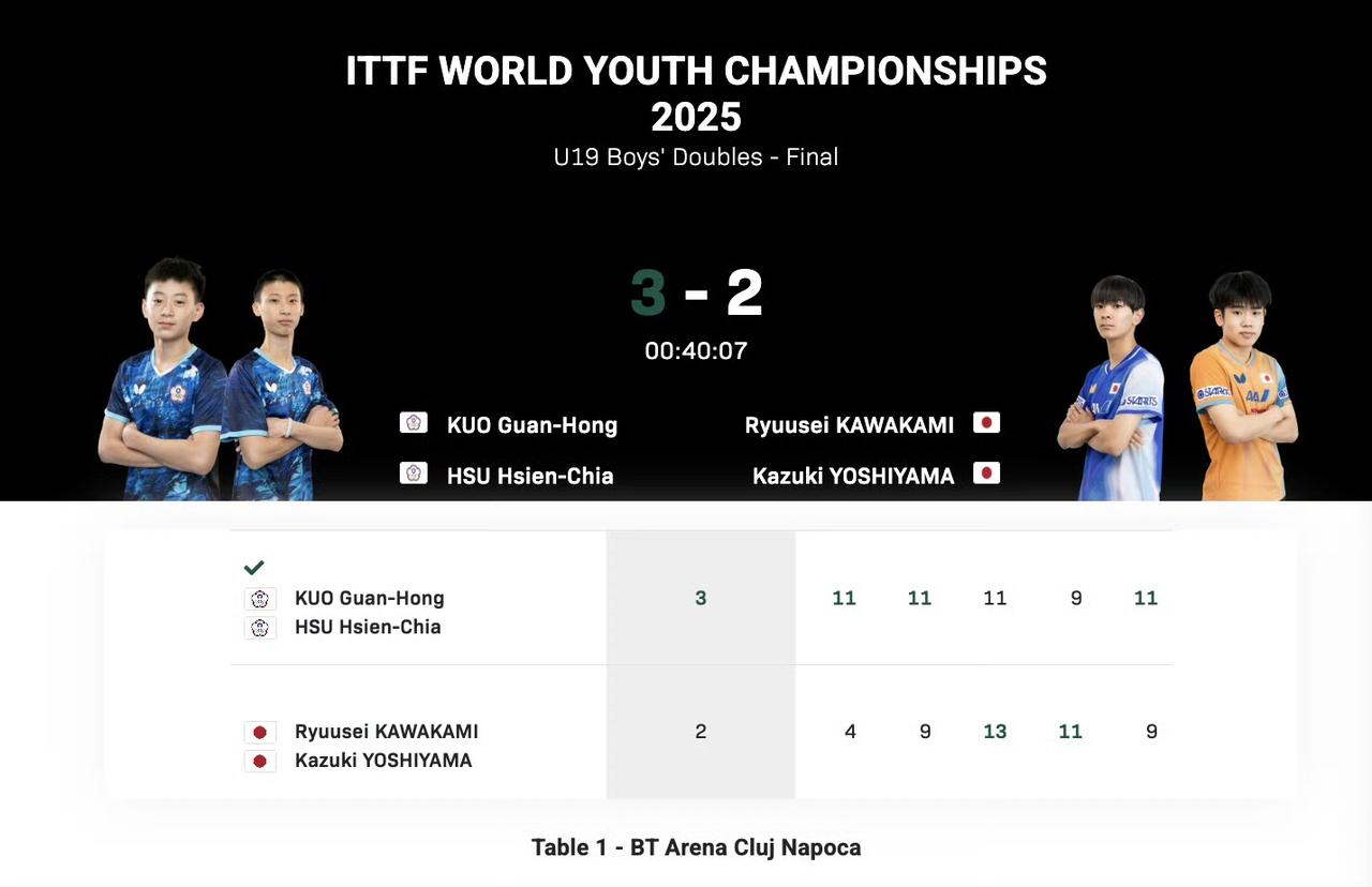 世青赛丨郭冠宏/徐絃家获U19男双冠军! 国际乒联世青赛U19 男双决赛,中国台北组合郭冠宏/徐絃家以大比分3比2战胜日本组合川上流星/吉山和希获得冠军,日本组合获得亚军! 国乒组合李和宸/温瑞博在半决赛不敌最终的冠军,最终位列四强!国乒男双近几年来是个短板,在很多比赛中都没能有太好的成绩,包括今年世乒赛也没能拿到好成绩!男双比赛项目已入选奥运会,我们还是要做好十足的准备!