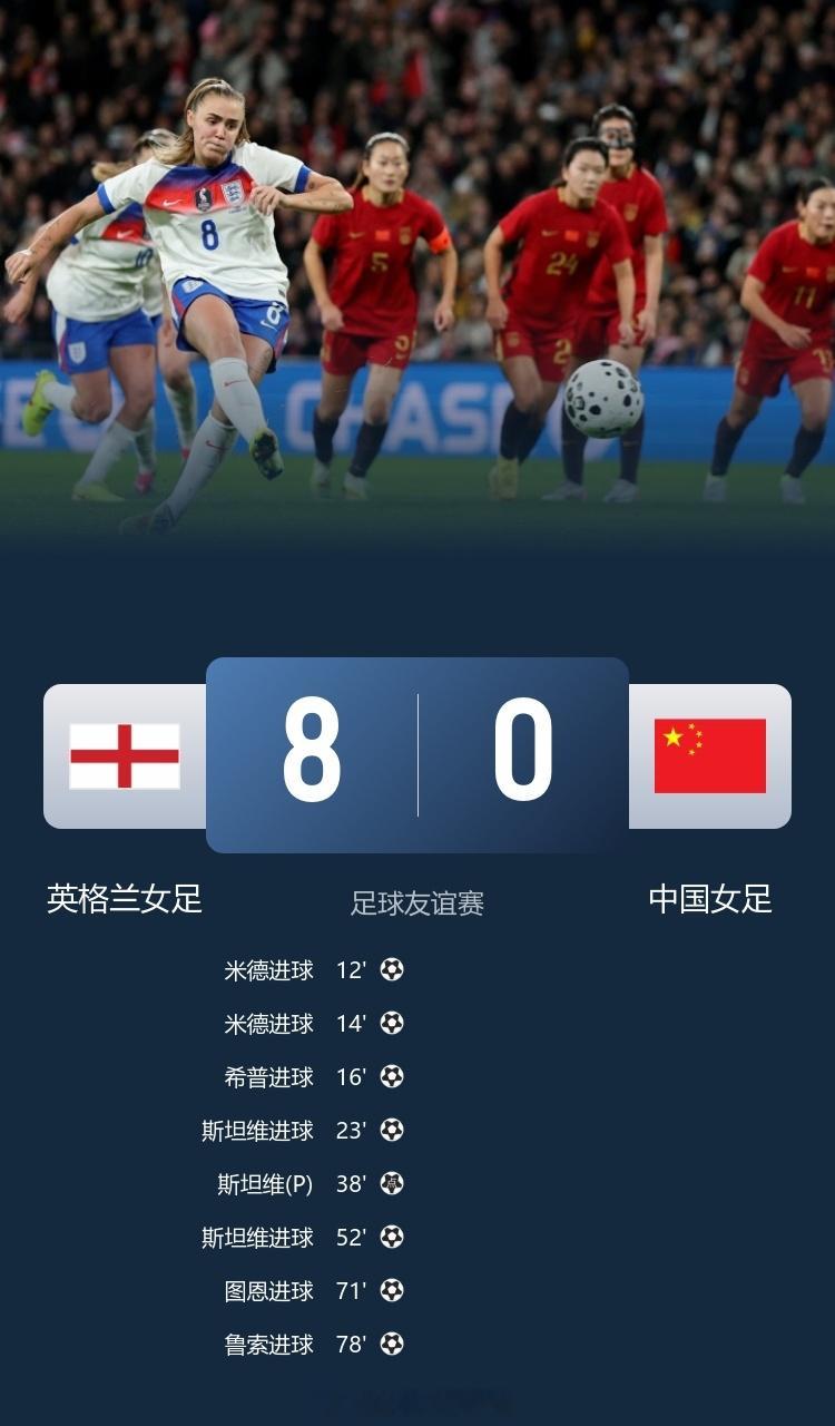 足球 惨败!中国女足0-8英格兰女足 全场遭压制中国女足0比8英格兰女足 11月30日讯 北京时间11月30日凌晨1时30分,2025年足球友谊赛在温布利大球场展开角逐,中国女足客场对阵英格兰女足。上半场中国女足11分钟连丢4球,李梦雯手球送点,下半场斯坦维帽子戏法,女足后场玩火送礼。最终中国女足客场0-8惨败英格兰女足,女足全场遭压制,控球仅3成+6射门2射正。双方都是有着自己的战术目的。从两队的阵容来看,中国队相对齐整,而英格兰队多人缺席,甚至有一半的球员都未能参加此前的欧洲杯,不过还是有两届的欧洲杯冠军成员凯利!从中国队的首发阵容来看,中国队是三中卫的体系。即便英格兰队阵容不整,她们的综合实力还是要在中国队之上。果不其然,开场仅仅12分钟,英格兰队便取得了领先,布隆泽传中,米德捅射破门,1-0中国队,仅仅过了2分钟,中国队再次丢球,图恩过掉防守球员之后传中、米德跟进破门,短短2分钟便完成了梅开二度。这还没完,第16分钟中国队再次丢球,斯坦维带球之后横传,亨普铲射轻松破门,3-0中国队,连续的丢球没有让中国队的后防线提升专注度,第23分钟希普又助攻斯坦维破门,将比分改写为了4-0。来到了第35分钟,英格兰队又获得了机会,李梦雯送点、斯坦维主罚轻松命中,5-0,比赛眼瞅着要被踢花了。上半场中国队几乎被全面压制,基本上是没有什么机会。下半场上来后不久,英格兰队又打出了精彩的配合,图恩直塞、斯坦维破门,完成了帽子戏法,中国队0-6落后,球队已经完全是没有了自信心,第71分钟中国队的后防线失误,传球失误,门将的开球被抢断,图恩笑纳大礼,7-0,第76分钟,英格兰队彻底是终结比赛的悬念,图恩直塞制造威胁,鲁索跟进的铲射破门,将比分定格在了8-0。