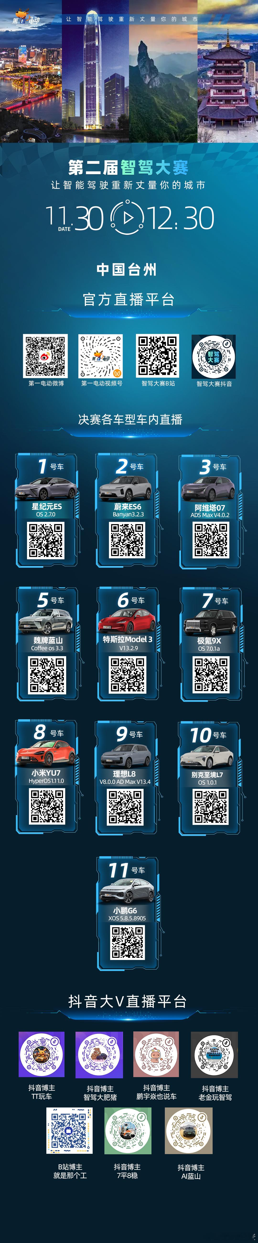 第二届智驾大赛-台州站决赛即将开始🚗智驾大赛车型集结完毕!✨科技感满满,这场较量一定超精彩!🤩1到11号车各有亮点,今天你最期待谁的表现?智驾大赛第二届中国智驾大赛