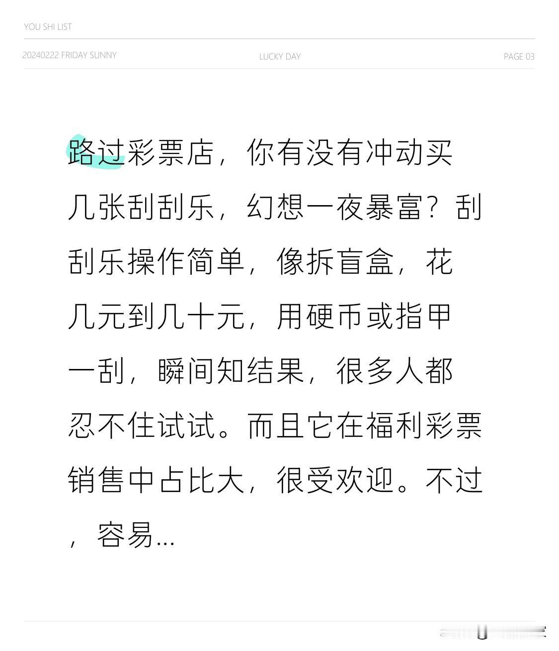 路过彩票店,你有没有冲动买几张刮刮乐,幻想一夜暴富?刮刮乐操作简单,像拆盲盒,花几元到几十元,用硬币或指甲一刮,瞬间知结果,很多人都忍不住试试。而且它在福利彩票销售中占比大,很受欢迎。 不过,容易买不代表容易中。理论上,每款刮刮乐中奖概率不同,小奖概率相对高些,大奖低得可怜,几十万分之一甚至更低。有专家说,就像大海捞针。整本刮刮乐中奖几率约30% - 45%,中大奖的更是少之又少。 我朋友小李是刮刮乐忠实粉,常去买,可大多时候就中个小奖。你买刮刮乐中过大奖吗?觉得它和其他彩票比,哪个中奖概率高?刮刮乐真能成为财富密码吗? 刮刮乐 刮刮彩票 彩票刮刮乐 刮刮乐一等大奖 刮刮乐体验 刮刮乐中奖代码 刮彩票 刮刮游戏 刮刮乐 刮刮彩票 刮刮乐一等大奖 刮刮乐体验 刮刮乐中奖代码 刮彩票 彩票版刮刮乐
