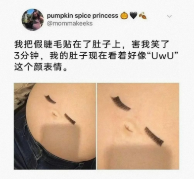 我把假睫毛贴在了肚子上,害我笑了3分钟,我的肚子现在看着好像“UwU”这个表情。