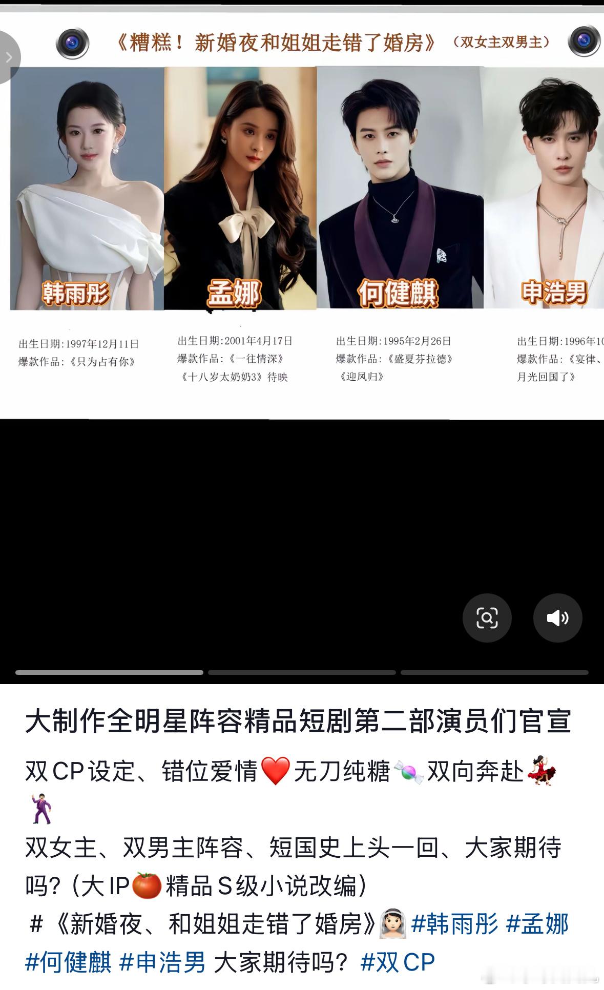 韩雨彤孟娜何健麒申浩男要拍双cp短剧