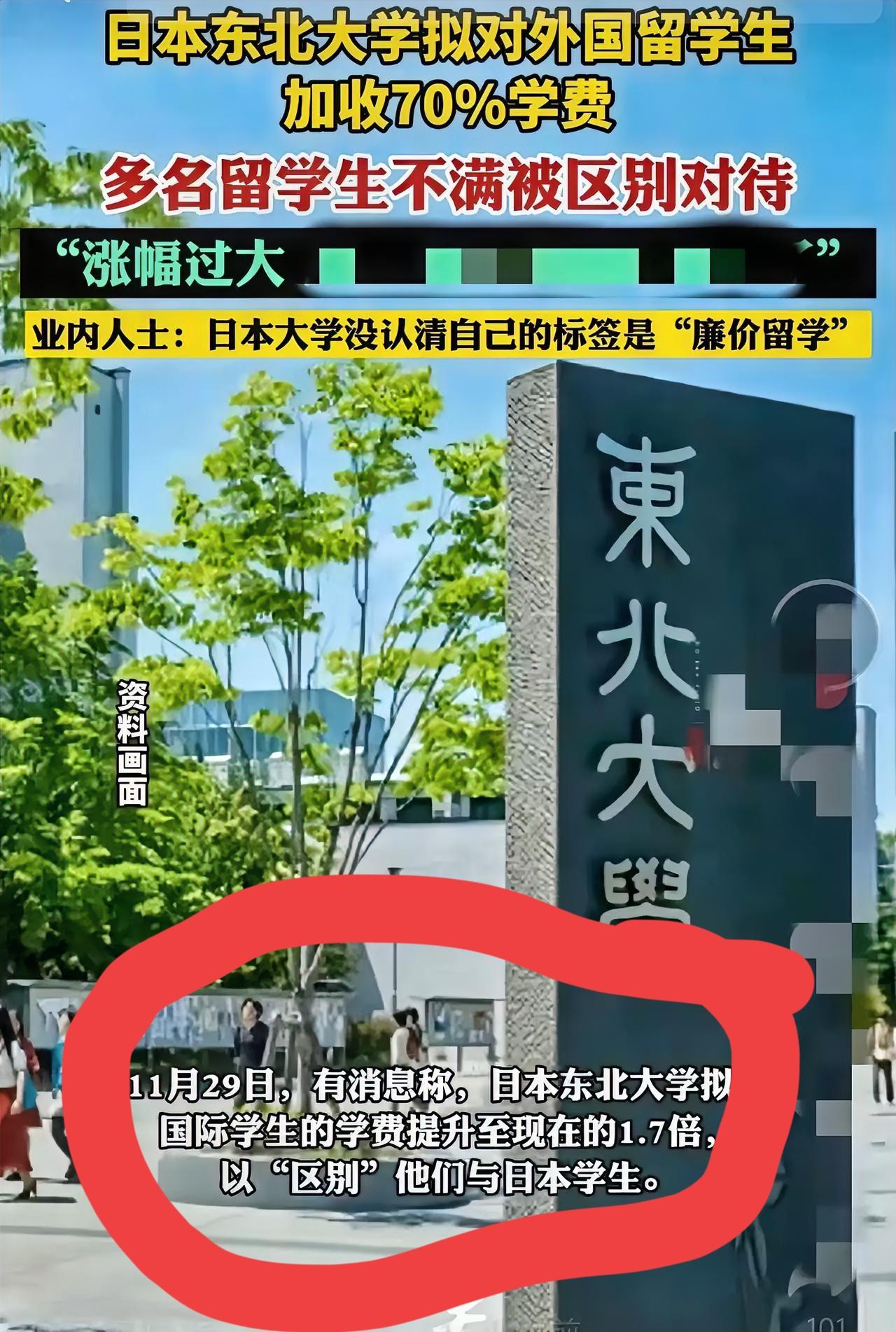 果然! 日本反制出来了! 11月29日,日本那边一个消息,不是军事行动,名校拟把留学生学费提到70%,一年多出1.7万元,本土学生那一栏不动。 东北大学这家百年老校,先开个口子,留学生那一行往上抬,2027年起,国际生每年多掏近1.7万元,本土学生原数不变,这一笔,三百本书,半年的房租,账单那一列不动,桌上摆着对比。 去年日本把法规改了,口径一松,学费这条线跟着动,大学有了空间,留学生和本土学生分开定数,东北大学像第一朵浪花,后面七十八所国立大学在准备,东京大学上调20%。 一边喊着留学生30万人计划,价格往上推,舆论里常见一句话,留学生占了本土资源,学校的说法和社会的议题放在一起,看的人自然有张表。 留学日本之前叫性价比,现在这块开始松,学费贴近欧美那条线,选校的人算账,语言再学一年,时间和钱摆桌上,路径不短,数字不小。 变动点在信任这块,年轻人拿着计划去申请,规则半路改一下,账单行不行是一层,变动这件事在心里,走到哪一步再看。 这个事怎么看,评论区交流。