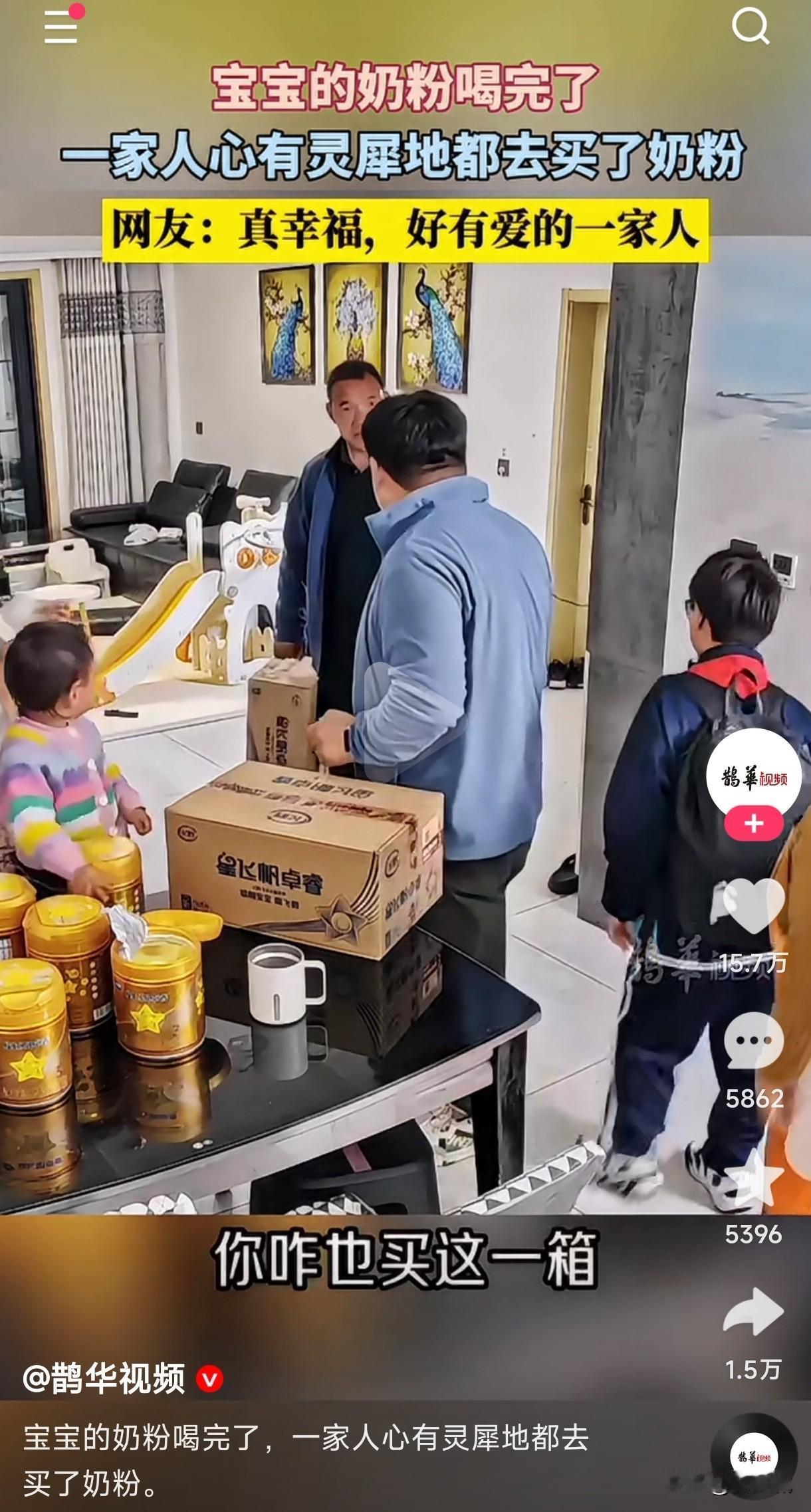 一家人心有灵犀的幸福感氛围羡慕吗? 宝宝奶粉没了,奶奶最早进门买了3桶,后面妈妈又买2桶,接着爸爸买了一箱,最后爷爷又买了一箱。 当四个人同时都买了奶粉的时候,都感到很诧异,只有爸爸妈妈,奶奶是看到孩子奶粉没了,专门去给孩子买奶粉的,只有孩子爷爷是算着日子孙女的奶粉应该喝完了,回家时买了一箱,四个人买同一件东西时彼此居然没有相互告知,看的出来这样的家庭氛围着实让人羡慕,可谓真正的拧成了一股绳,心往一处想,劲往一处使。 如此幸福感满满的家庭氛围视频发到网上后,有些宝妈瞬间破防了,甚至说自己家四个人就是东南西北风,各刮各的风,各使各的心眼子,看看人家这才是真正的家和万事兴,自己家就像四大名著似的,真是有苦难言,果然啥都是别人家的好,你们是不是也这样认为呢?羡慕这样的家庭氛围感吗?