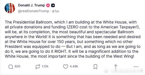 【黄金时代】川普再次重申,白宫建造的总统宴会厅,全部资金和捐款都来自私人捐赠川普:我正在白宫建造的总统宴会厅,全部资金和捐款都来自私人捐赠(美国纳税人无需承担任何费用!),建成后将成为世界上最美丽、最壮观的宴会厅!150多年来,白宫一直需要并渴望拥有这样的宴会厅,但此前没有任何一位总统有能力完成这项工程——但我有能力,既然要做,就要做到最好。这将是白宫的一项宏伟工程,是自西翼建成以来最重要的工程!美国和欧洲当代史川普主义研究热点现场海外新鲜事