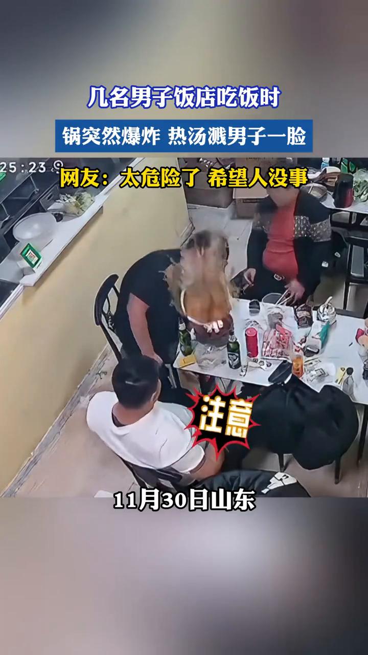 几名男子饭店吃饭时锅突然爆炸,热汤溅男子一脸。网友:太危险了,希望人没事。 11月30日山东。