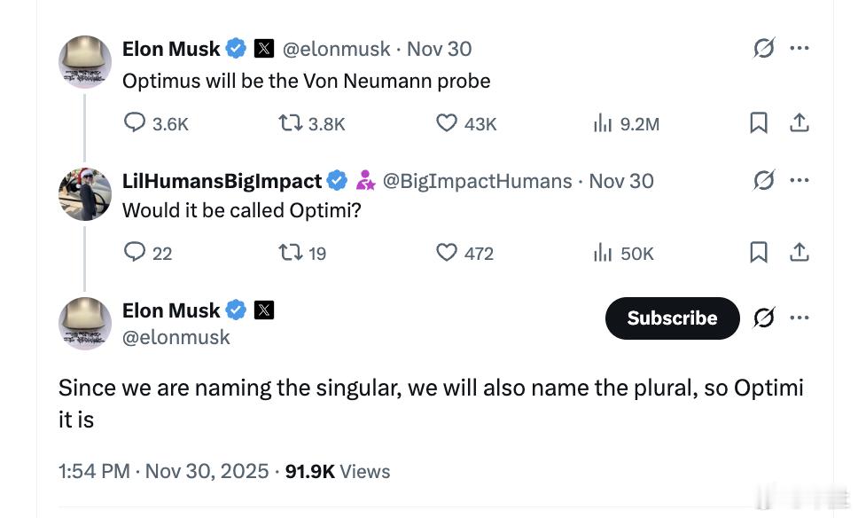 推特上有网友向马斯克提问,人行机器人Optimus的复数形式应该怎么表达,马斯克回复道,既然我们给它起了单数形式的名字,那复数就叫Optimi吧!这番表态能看出马斯克对机器人业务寄予厚望,在他的规划中,Optimus将是特斯拉产量最高的产品,最终年产量可能破亿,全世界随处可见。马斯克