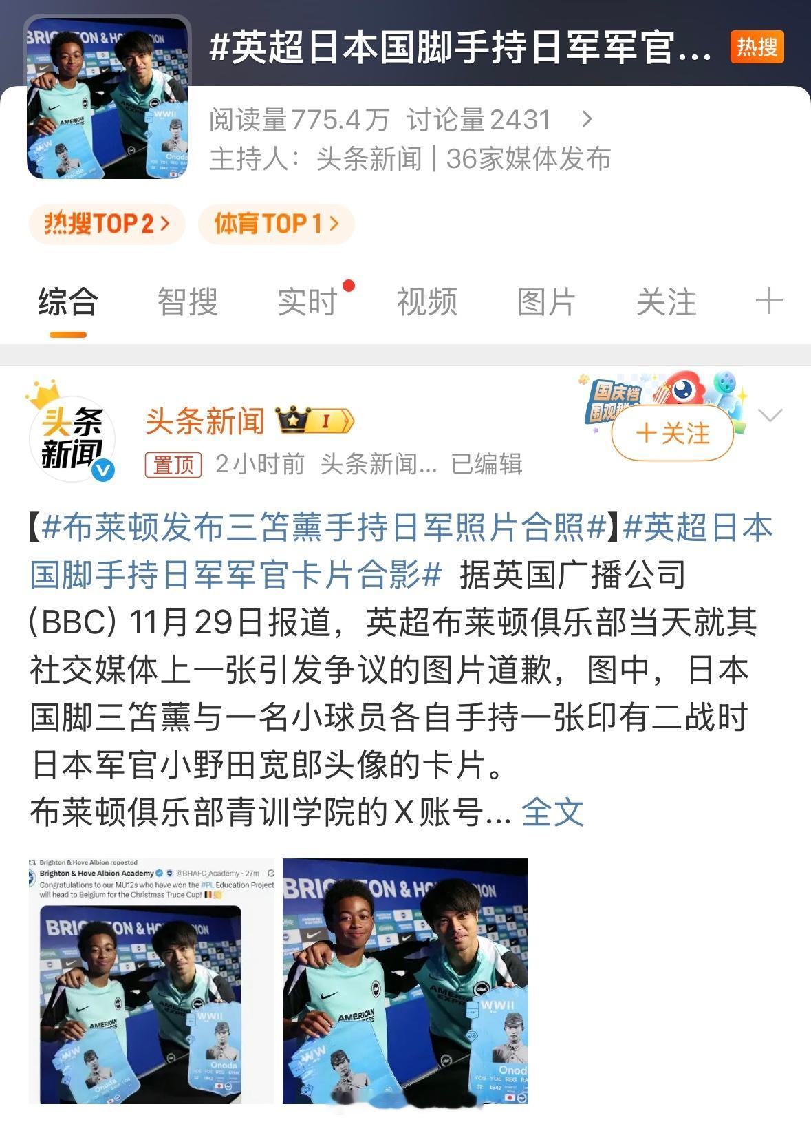 过去几天了,终于有媒体报道这事了,另外说下,道歉是青训账号发的,并不是俱乐部官方账号英超日本国脚手持日军军官卡片合影 英超球队向中国球迷道歉