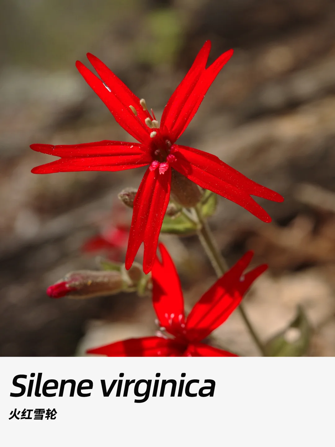 🌺🌺【林间跳跃的火焰精灵】🌺🌺 ▫️𝙉𝘼𝙈𝙀 「火红雪轮」Silene virginica ▫️𝙁𝙇𝙊𝙒𝙀𝙍 𝙎𝙃𝙊𝙒 🔥 花瓣呈现鲜亮的朱红色,在野外野花中这种鲜艳的朱红色并不多见,显得格外耀眼 🌸 花朵结构典型,花瓣分离,色彩浓郁,在绿叶衬托下格外醒目 🌿 植株形态优雅,花期时花朵点缀在茎叶之间,形成鲜明对比 ▫️𝙃𝘼𝘽𝙄𝙏𝘼𝙏 🌳 原生地主要分布在北美洲的山林环境中,喜欢生长在林下或林地边缘 🍂 适应林下的光照条件,在斑驳的树荫下生长良好