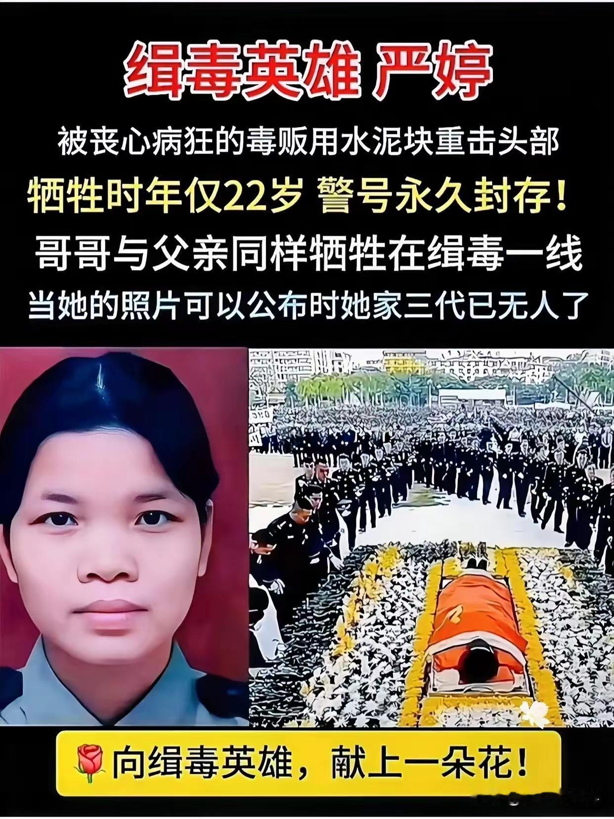 22岁的缉毒英雄严婷,把宝贵的生命献给了禁毒! 她爸和哥都倒在了禁毒一线,她没说啥,默默跟着进了警队,最后和毒贩拼命时,永远离开了。现在她家里没直系亲人了,警号也永久封存,一家三代,全为禁毒拼了命。 ​​毒品只要还在,禁毒就不能歇,这从不是警察单干的事,是咱们所有人的责任。咱不碰毒品,就是给缉毒警多一分安全。 ​​哪来的岁月静好?都是有人替咱扛着风险!致敬所有缉毒英雄!咱都守住底线,珍爱生命、远离毒品,一起把家园建成无毒的!严婷一家三代的壮举,如同一座不朽的丰碑,矗立在禁毒的历史长河中。他们用生命诠释着对国家和人民的忠诚,也让我们看到了禁毒事业背后那无数不为人知的艰辛与牺牲。 在那些隐蔽的战场,缉毒警们时刻面临着生死考验。他们深入毒窝,与毒贩斗智斗勇,每一次行动都可能是最后一次。他们不能像普通人一样享受生活,甚至不能公开自己的身份,为了守护我们的安宁,他们默默承受着一切。 而我们作为普通民众,虽然无法像缉毒警那样冲锋陷阵,但我们可以从自身做起,积极传播禁毒知识,让更多的人了解毒品的危害。遇到可疑的涉毒行为,要勇敢地向警方举报,为禁毒工作贡献自己的一份力量。 我们要让严婷一家的精神永远传承下去,让更多的人加入到禁毒的行列中来。相信在全社会的共同努力下,我们一定能彻底铲除毒品这个社会毒瘤,让我们的家园真正成为无毒净土。让我们再次向所有缉毒英雄致敬,他们的付出,我们永远铭记!