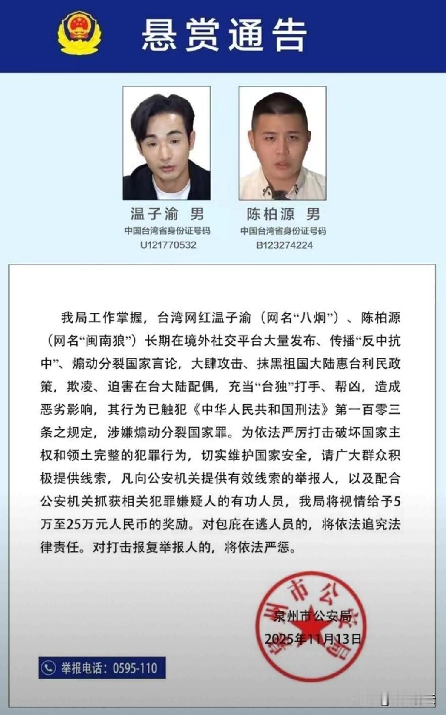 “台独”分子还在做白日梦?2025年以来大陆惩“独”重拳不断,温子渝、陈柏源被悬赏通缉,沈伯洋遭立案侦查,连家人都受牵连。 他们勾连外部势力搞分裂,以为有靠山就能得逞,却让台湾民众跟着担风险,现在岛内支持“台独”的人越来越少。 两岸贸易依存度超40%,本是血浓于水的一家人。那些搞分裂的不过是跳梁小丑,人民日报的警告绝非空话,再敢玩火,只会被永远钉在历史耻辱柱上!