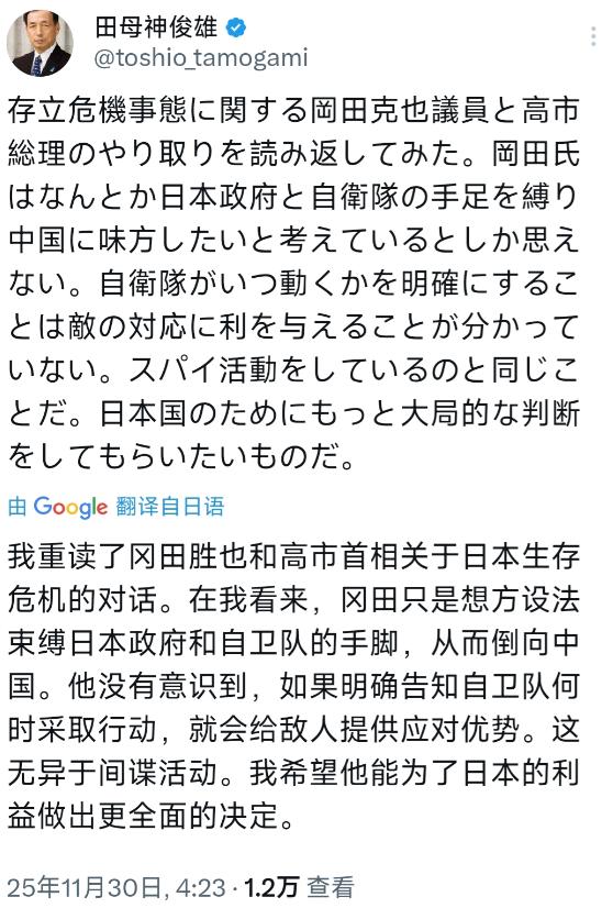 日本右翼势力狂妄至极!11月30日,日本航空自卫队参谋长田母神俊雄发文表示,冈田只想约束日本政和自卫队的手脚从而倒向中国,他没意识到如果明确告知自卫队,就会给敌人提供应对优势。无异于间谍活动,望他能为日本做出全面决策。 11月30日,日本前航空自卫队参谋长田母神俊雄在社交平台发了篇文,把矛头直指冈田,说人家想约束自卫队手脚倒向中国,还扣了顶“间谍活动”的大帽子,逼着冈田给日本做“强硬决策”。 田母神这身份可不一般,当过航空自卫队的最高长官,现在跳出来这么骂,明摆着是给右翼站台,尤其是力挺高市早苗,对着国内温和派往死里逼,这猖狂劲儿真是没谁了。 你可能不知道,这主儿可不是第一次跳出来作妖,2008年他就因为公开否认日本侵略历史,还说要给美国扔原子弹报复,直接被日本政府免职,当年这事儿闹得全世界都知道。 到了2014年他更离谱,在电视节目里公开支持参拜靖国神社,说中韩批评是小题大做,甚至放话要“攻击对方痛处”,那股子蛮横劲儿跟现在骂冈田的样子一模一样。 2015年二战胜利70周年的时候,他更敢说,声称“没有南京大屠杀,没人看见日军杀人”,还说日本当年是“解放亚洲”,把侵略说成行善,这颠倒黑白的本事真是练到家了。 这次他骂的冈田,是日本政坛出了名的温和派,一直主张跟邻国保持沟通,不想把关系搞僵,可在田母神眼里,不跟中国硬刚就是“通敌”,这逻辑简直荒唐到极点。 他力挺的高市早苗更不用提,11月14日就在国会放话搞挑衅,当时中国驻日大使就专门去交涉过,现在田母神跳出来助威,明显是右翼势力在抱团施压。 你说怪不怪,这些右翼每次跳出来都拿“国家利益”当幌子,可他们搞的这套对抗,最后受苦的还不是普通老百姓?真为国家好会天天喊着挑事吗? 更值得警惕的是,田母神这种前军方高官跳出来,背后肯定有右翼势力在撑腰,最近日本防卫预算一涨再涨,右翼又开始煽风点火,这套路跟几十年前何其相似。 日本国内也不是没人反对,11月30日当天就有日本民间团体上街抗议,举着“反对右翼挑事”的牌子,说明清醒的日本人还是不少的,就是声音被右翼盖过了。 田母神们总以为喊几句狠话就能唬住人,可现在的中国早就不是当年了,更别说全世界都在盼着和平,这种老调重弹的军国主义把戏,谁还会信? 想想看,一个连历史都不敢承认的人,一个动辄给人扣“间谍”帽子的人,他嘴里的“全面决策”能靠谱吗?说白了就是想把日本往对抗的死路上带。 右翼再猖狂也翻不了天,毕竟和平是大势所趋,可他们这种跳脚的样子也提醒我们,狼子野心从来不会彻底消失,保持警惕才能守住安宁。 靠骂街和扣帽子撑不起所谓的“强大”,承认历史、好好对话才是正道。田母神们的闹剧终会落幕,可留下的警示不会消失,和平这根弦,谁都不能松。
