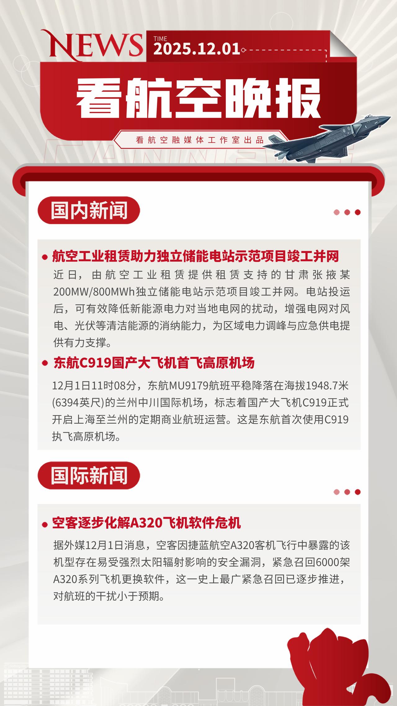 12.1晚报 航空工业租赁助力独立储能电站示范项目竣工并网 东航C919国产大飞机首飞高原机场 空客逐步化解A320飞机软件危机