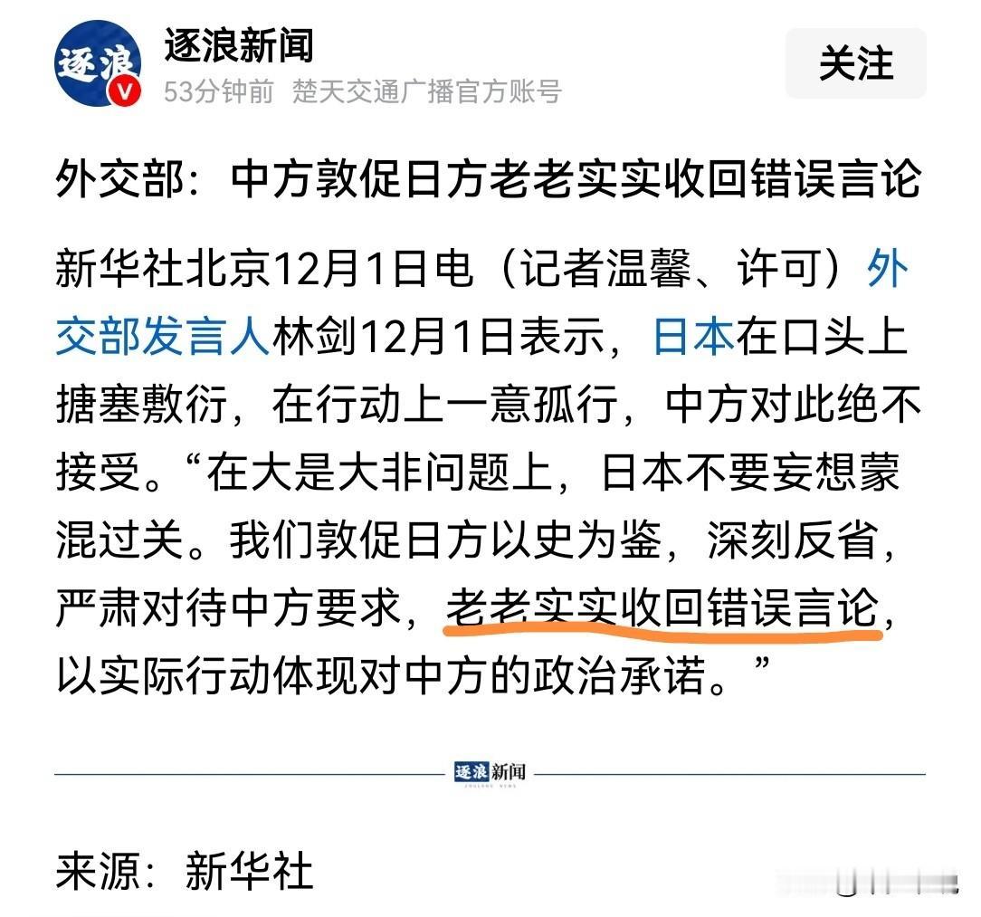 开始战略上藐视,中国用“教训”语气要求日本收回错误言论 外交部让日本老老实实的收回错误言论,而“老老实实”这个词通常是大人“教训”孩子,或者领导“训斥”下属的语气,同时“老老实实”也是强者“训斥”弱者的口吻。 国家外交部用“老老实实”这种带有“训斥”语气来要求日本收回错误言论,也是说明中国已经开始从战略上藐视日本了。