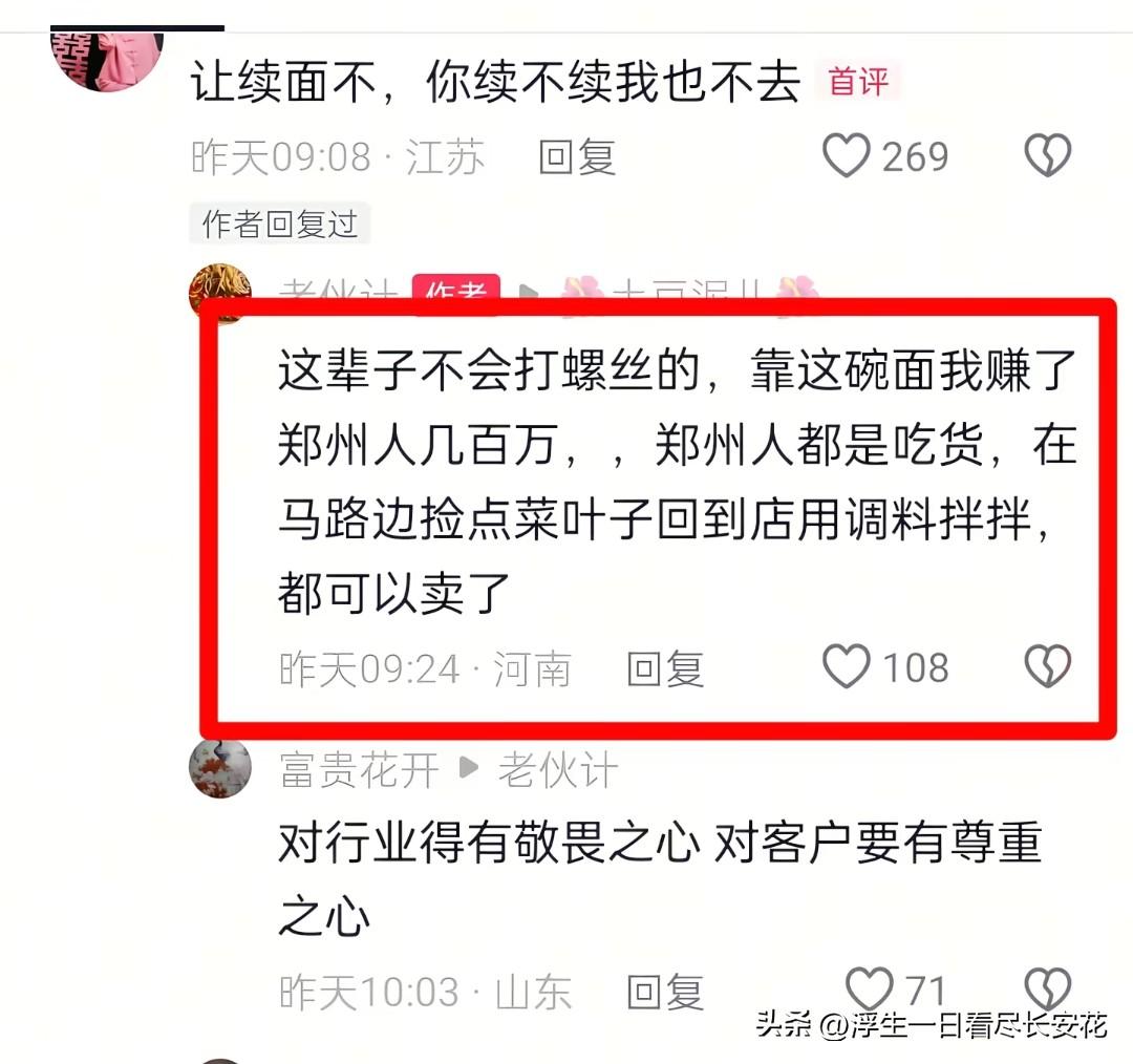 郑州“续面事件”霍老板又开新店了,之前还承诺永久闭店,果然满嘴跑火车的人,没一句实话呀!当事顾客目前仍在维权,明日召开庭前会议!目前来看,这位老板的胜算不大,口碑也不太好,之前还想吃互联网这口饭,但网友们并不想让他得逞。 所以续面老板只能继续干老本行开维持生计,别的路基本被自己玩没了。有网名叫“富贵花开”山东网友这样回复他:“对行业得有敬畏之心,对客户要有尊重之心。”不知道霍老板有没有看到,有没有听进去,估计很难,从几场直播来看,基本都是卖惨,就跟很多人想的那样,他不是知道错了,是知道自己的面馆要完了。 早知如此,何必当初呢?从霍老板德性来看,他实在是太想吃互联网这碗饭了,开面馆不是目的,能火才是目的,真的是醉翁之意不在酒呀!