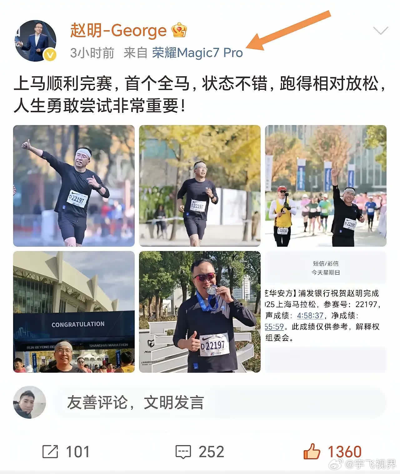 明哥跑完全马了!而且有眼尖的网友发现了吗?他手里拿着的,依然是那台荣耀Magic7 Pro 这款他倾注心血打造的旗舰,依然是他日常的主力机
