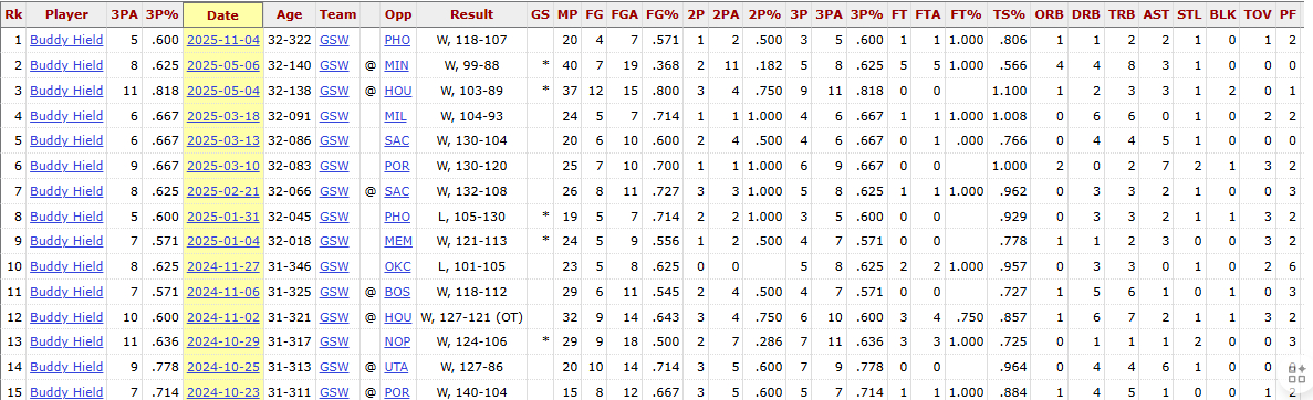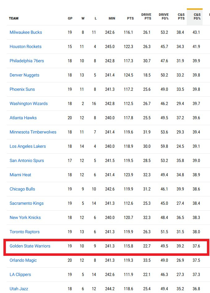 金州勇士 勇士在体系和核心创造机会的前提下,投丢了大量的投篮,在接球就投的统计中排名靠后。本赛季,波斯特、希尔德军没有达到射手的水准。需要说明的是,自从勇士队迎来巴迪希尔德的加盟后,仅有15场比赛中希尔德的三分球出手超过5次且高命中率,而勇士队在这15场比赛中的战绩为13胜2负。本赛季至今,这仅发生在一场,是在面对太阳时轻松取胜的比赛。希尔德在本赛季前21场比赛中仅命中28记三分,这是他自新秀赛季以来最差。
