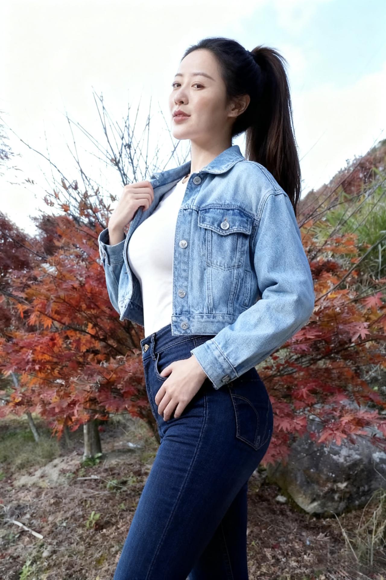 牛仔白衫自不凡,秋光为衬鬓云鬖。 枫红欲染眉间色,笑靥轻开胜菊簪。