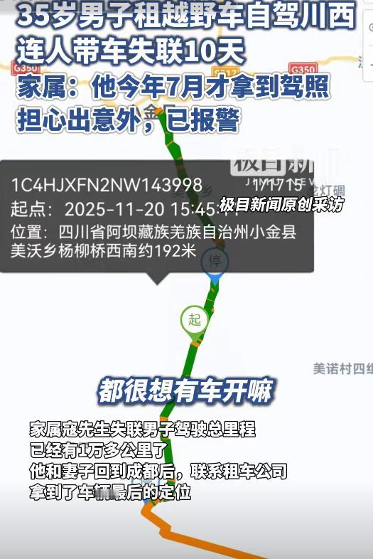 最新进展:自驾川西35岁失联男子遗体已找到!刚拿驾照不到4个月 人生无常,世事难料!明天与意外不知道哪一天先到,我们要珍惜现在。 35岁男子陈先生因为喜欢越野、户外,于是在今年7月份刚拿驾照不到4个月,就租车自驾川西。 失联10天,陈先生的家人就发寻人启事、报警等找人,陈先生的姐夫更是直接去了失联点寻找。 据极目新闻12月1日最新消息,当天下午他们已经发现陈先生的车辆及遗体,车子滚落山沟摔得只剩框架。 对于刚拿到驾照的人,有点手痒,想开车无可厚非,但不是像陈先生这样自驾蜿蜒道路川西,只能说胆子太大了。 据陈先生的姐夫寇先生接受采访时透露,小舅子今年才35岁,是四川绵阳人,在成都从事餐饮相关的工作。 男孩子都有喜欢刺激,陈先生也不例外,喜欢越野及户外,于是在今年7月份的时候,考了驾照,拿到了驾驶证。 而对于新手司机而言,尤其是刚拿到驾照的人,就想过开车的瘾,陈先生就想了一个办法,去租了一辆越野车,开启了川西自驾游的旅程。 于是在11月16日成都东站出发,然后经过都江堰,然后往甘孜、阿坝方向开启了自驾游的行程。 令大家没想到的是,在行驶到四川雅安周边的时候,陈先生的家里人就联系不上他了。 陈先生的家人联系了租车公司,发现了陈先生已经行驶了一万多公里,最后的定位地址在小金县美沃乡附近。 于是陈先生的家人于11月21日当天就报警了,然后陈先生姐夫就直接去了最后失联的地点,但是一直找不到车。 在寻找陈先生的过程中,陈先生家人在网上广发寻人启事,希望看到此车的人能提供一些线索。 但是一直都没有消息,12月1日,陈先生的姐夫寇先生担心车子掉到山沟去了,于是又去最后定位寻找。 悲剧的是,陈先生的车辆在山沟沟底找到,车子被撞得破败不堪,可以说只剩一个框架了。 而遗憾的是,陈先生也已经离世了,只看到了他的遗体,躺在半山腰处。 陈先生租的车与遗体就是在车最后的定位附近找到的。 目前,陈先生的姐夫寇先生,就想办法将陈先生的遗体运回老家。 这个悲剧给大家敲响了警钟,安全胜过所有一切。 对于新生司机来说,再手痒再想尝鲜,去自驾游要慎重,如果长途自驾的话,最好不要去,如果一定要去,最好有老司机陪同。 陈先生已经离世,才35岁,留给家里人的悲痛及懊悔大家都懂。 另外值得一提的是,这辆车是租的,陈先生家里人是不是还需要赔偿这辆租的车呢。