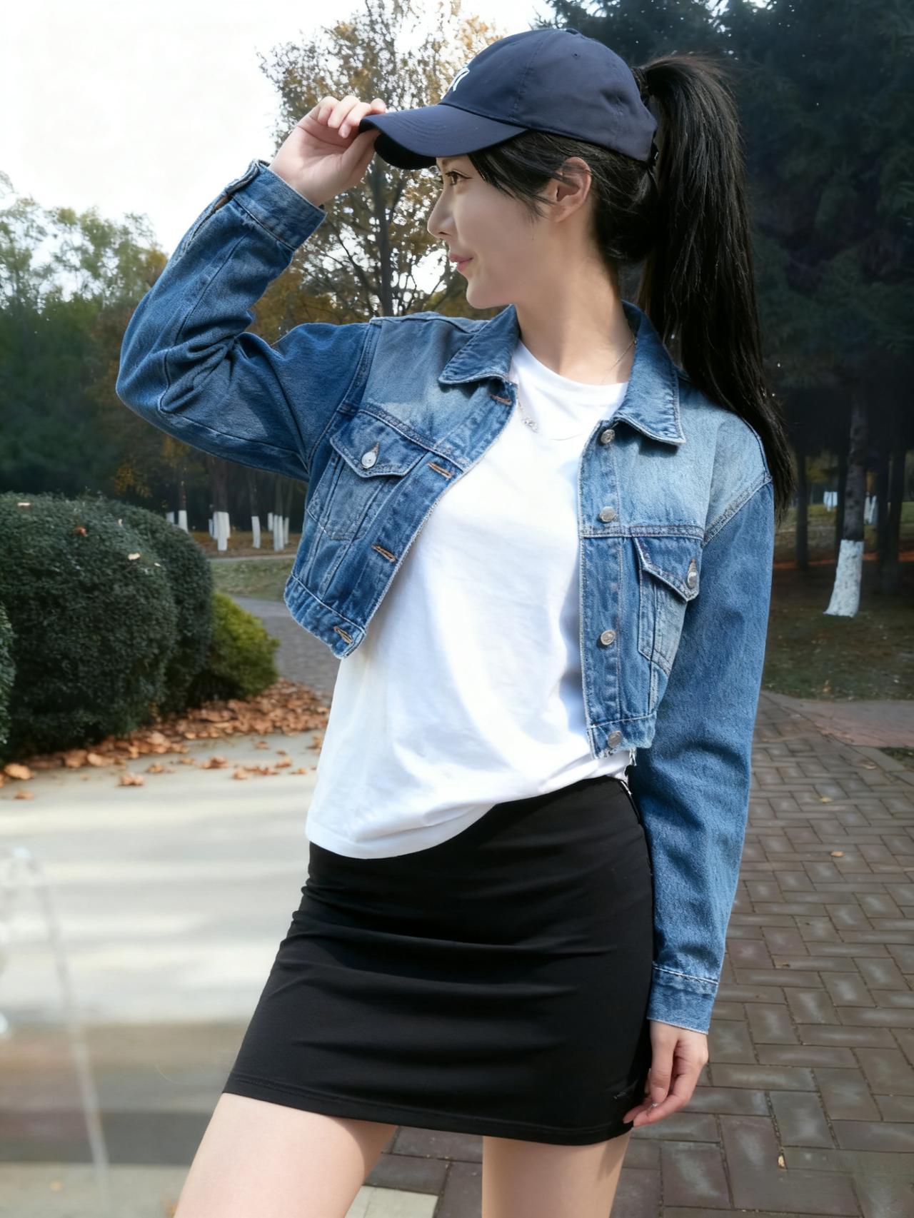 牛仔白衫自不凡,秋光为衬鬓云鬖。 枫红欲染眉间色,笑靥轻开胜菊簪。