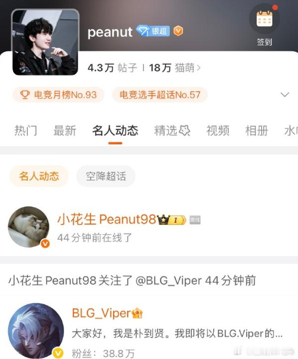 果然韩旺乎也在吃瓜的第一线啊!登上微博后,Peanut第一时间关注了BLG-Viper好兄弟在LPL加油,也期待Peanut未来重返职业赛场!!Peanut关注ViperTarzan回复Viper2025LOL冬季转会期