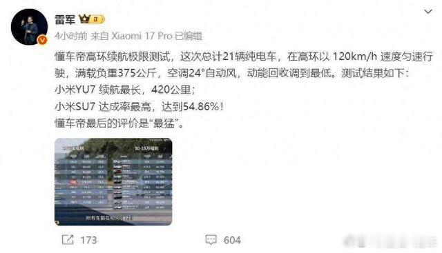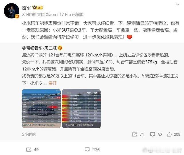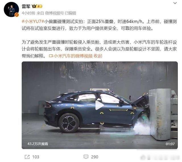 左右观车 【雷军评价小米汽车,还请大家帮忙解释所谓“轮毂设计不坚固”,是真不坚固吗?】雷军评价背景:近日懂车帝搞了个极限续航测试,发布了以下测试结果:小米SU7以54.86%的续航达成率,位居20万元级车型第一;小米YU7实测续航达420公里,是所有车型中最长的。雷军评价:1.小米汽车能耗表现也非常不错,大家可以仔细看一下。评测结果弱于特斯拉,也有一定客观原因:小米SU7是C级车,车大配置高,车会重一些,能耗肯定会高。当然,我们会继续向特斯拉学习,进一步优化能耗表现!2.懂车帝高环续航极限测试,这次总计21辆纯电车,在高环以120km/h速度匀速行驶,满载负重375公斤,空调24°自动风,动能回收调到最低。测试结果如下:小米YU7续航最长,420公里;小米SU7达成率最高,达到54.86%!懂车帝最后的评价是“最猛”。3.小米偏置碰撞测试实拍:正面25%重叠,时速64km/h。上市前,碰撞测试将在试验室反复进行,致力于为用户提供更安全、可靠的用车体验。为了避免发生严重碰撞时轮毂侵入乘员舱,造成更大伤害,小米汽车的车轮连杆设计会将轮毂抛出车体,保障乘员安全。很多人会误以为是轮毂设计不坚固,请大家帮我们解释。