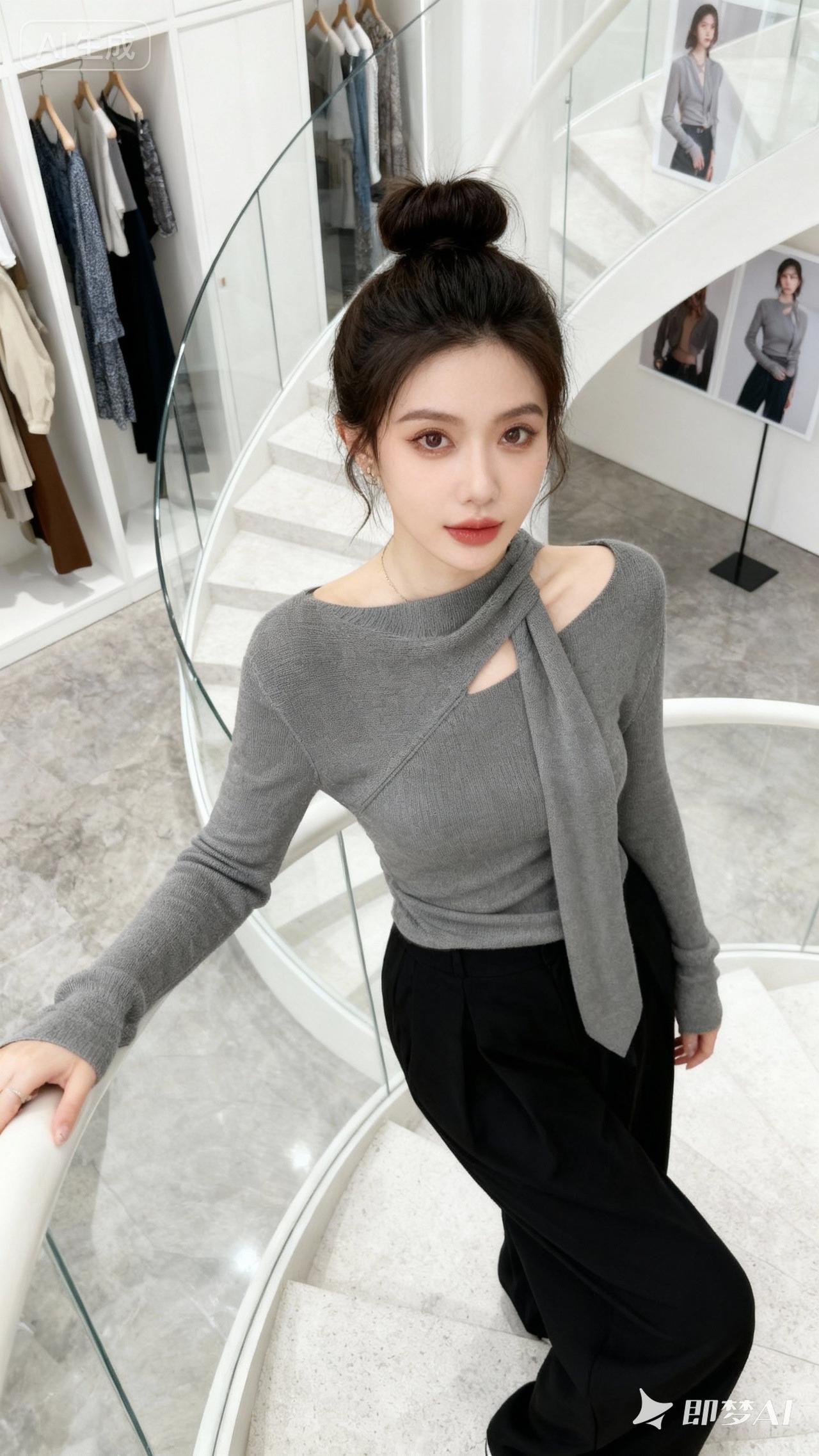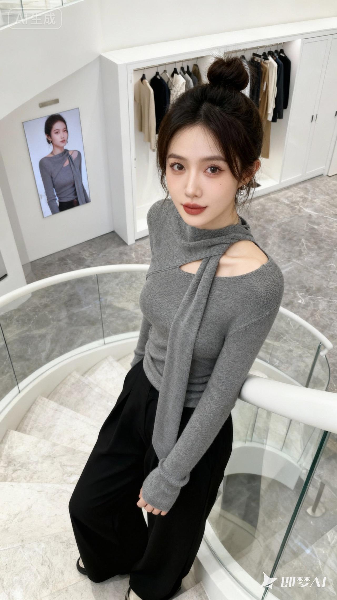 一位25岁女士,梳着丸子头,精致妆容,穿着图中灰色带斜跨飘带设计的露肩长袖针织衫➕黑色阔腿裤 背景有玻璃扶手的白色螺旋楼梯、挂着多件衣物的白色衣柜、墙上挂着模特同款造型的海报,地面为灰色大理石质感,整体风格简约时尚