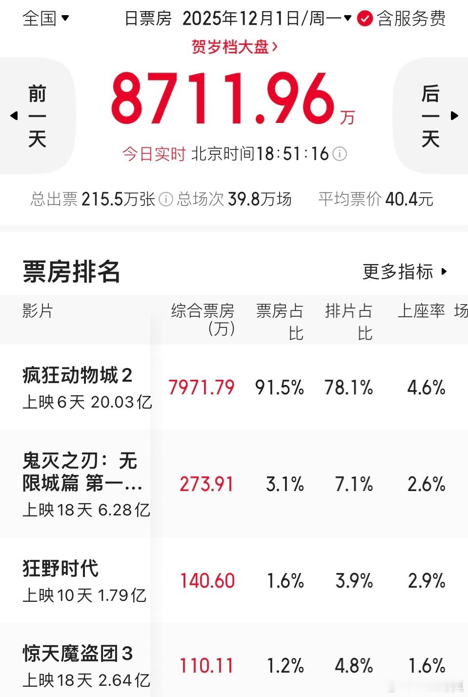 疯狂动物城2攀升到年度票房第四位。阿凡达3肯定比不了动物城2在国内的票房,