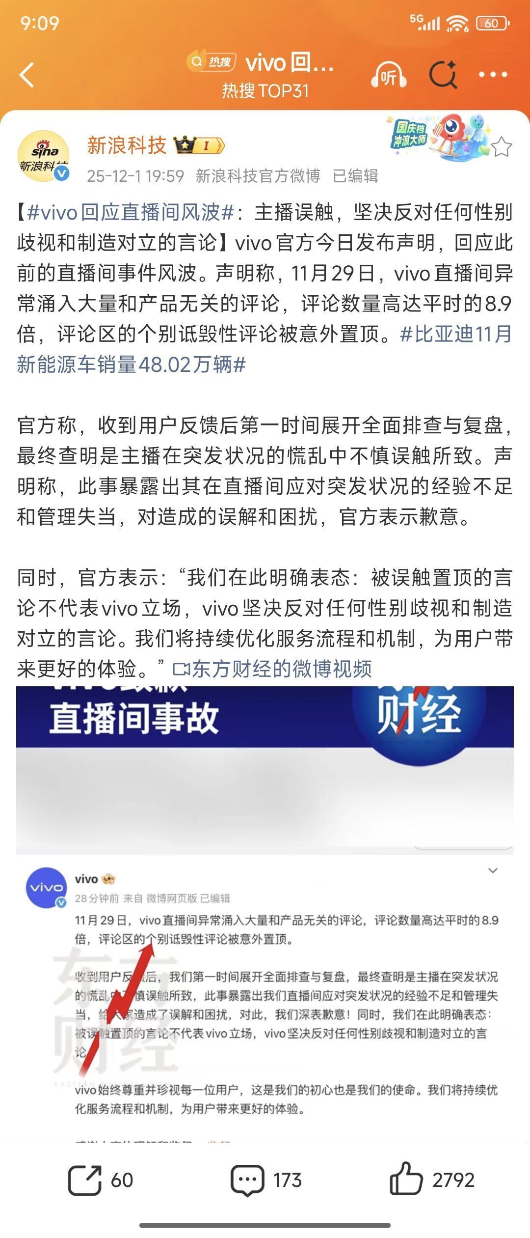 哦,误触啊,那没事了。我就说vivo官方不可能置顶这种带有明显歧视的评论。不过要我说,误触这事,直播间主播也得处罚,误触以后就不审核一下,主动道个歉哪还有这事?!