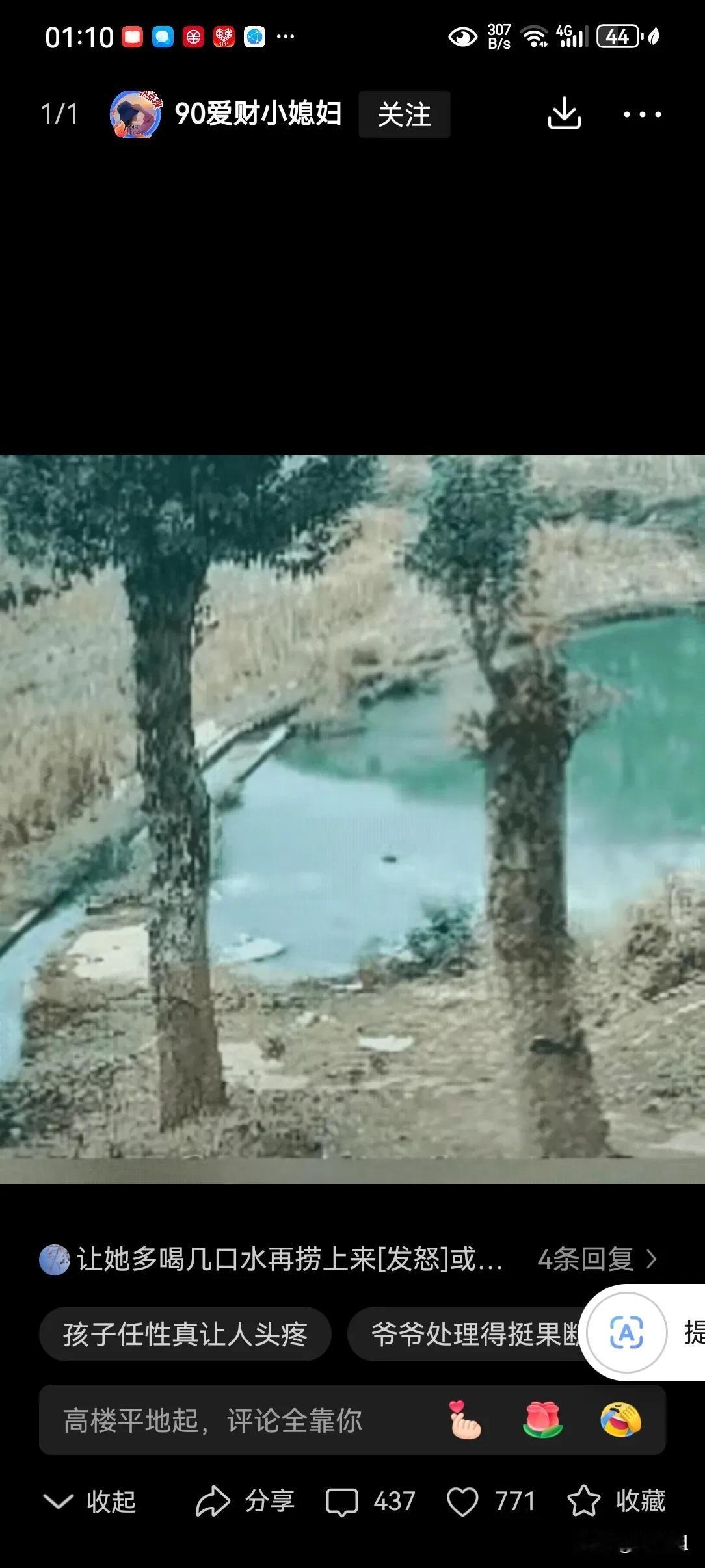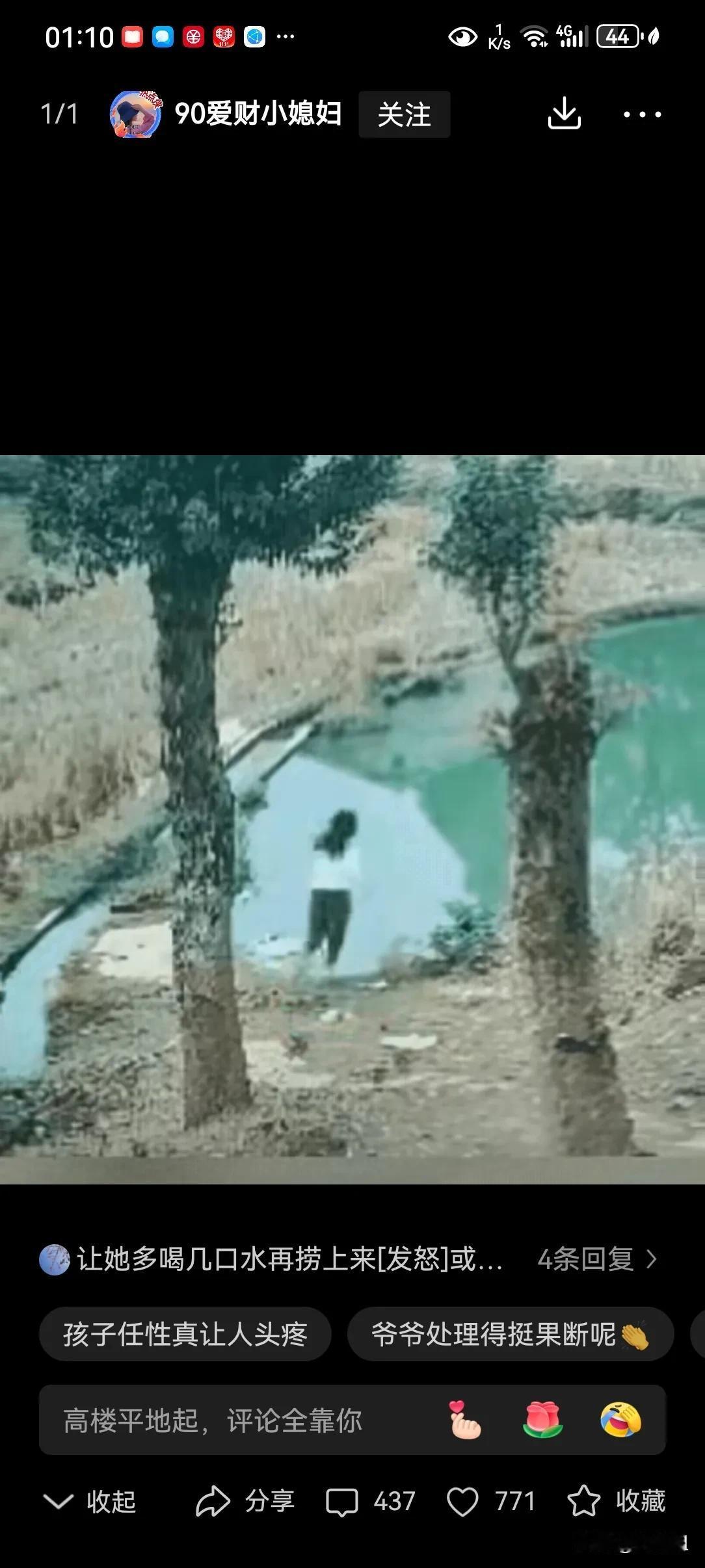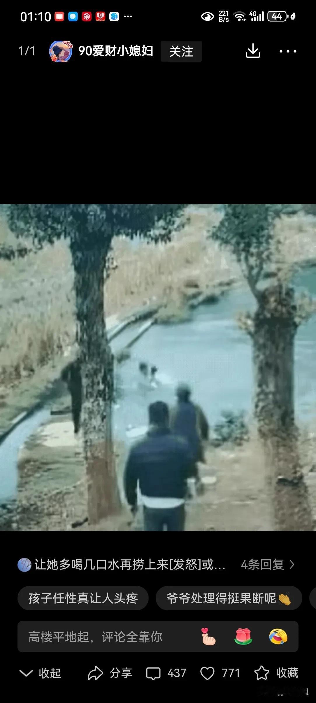 惯子如杀子! 一小姑娘抱着手机玩不吃饭,爷爷连喊带劝,嘴皮子都磨破了,她眼皮都没抬一下。 老爷子伸手就把手机夺了过来。没曾想小姑娘摔门直奔家门口的池塘跳了下去。爷爷眼见孙女落水,扯掉身上的厚棉袄,一头扎进池塘里。万幸池塘水不深,爷爷一把抓住在水里扑腾的孙女,拼尽全力拖到岸边。周围邻居听见动静,也都赶紧跑过来搭把手。 网友评论: 这下好了,爷爷奶奶以后指定不敢管她玩手机了,生怕再出点意外,这责任谁也担不起。可越这样纵容,孩子的脾气只会越娇纵,以后迟早要出大问题。 现在宠溺过度的小孩很多,亲戚家就有一个 管不了?没个管不了,我姑娘拿刀威胁我,说要割手腕,我说赶紧的,不割我帮你,一下就老实,下回再也不威胁我了 为啥要拉她上来呢?正确的做法是把她头按进水里,五秒左右提出水,间隔两秒再按入水。反复无数次!让她好好尝尝跳水的滋味儿。 这么任性的孩子如果不加强教育,长大以后怎么可能遵纪守法?怎么可能遵守社会规则? 既然水浅,就让她多凉快会儿。 如果道理能讲通,就不会去跳水池了。 所以说我个人觉得还是以暴制暴,别千篇一律的说说教有用,这玩意儿真的分人。
