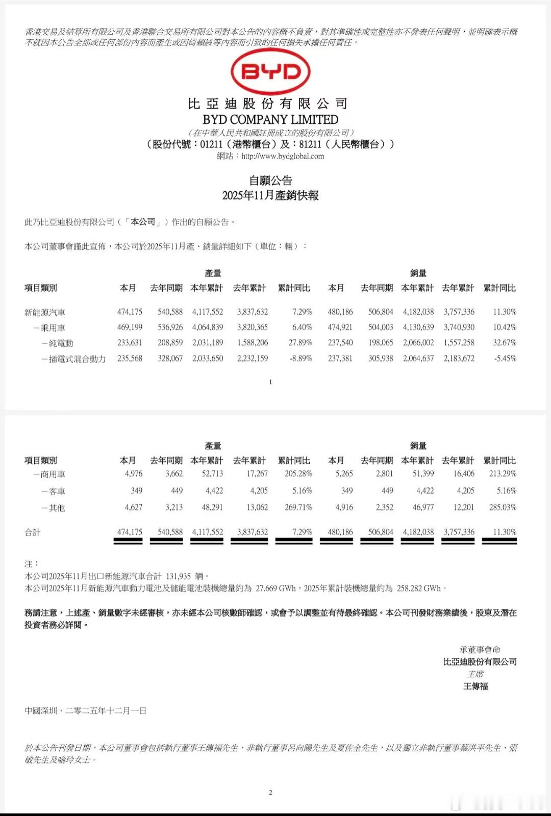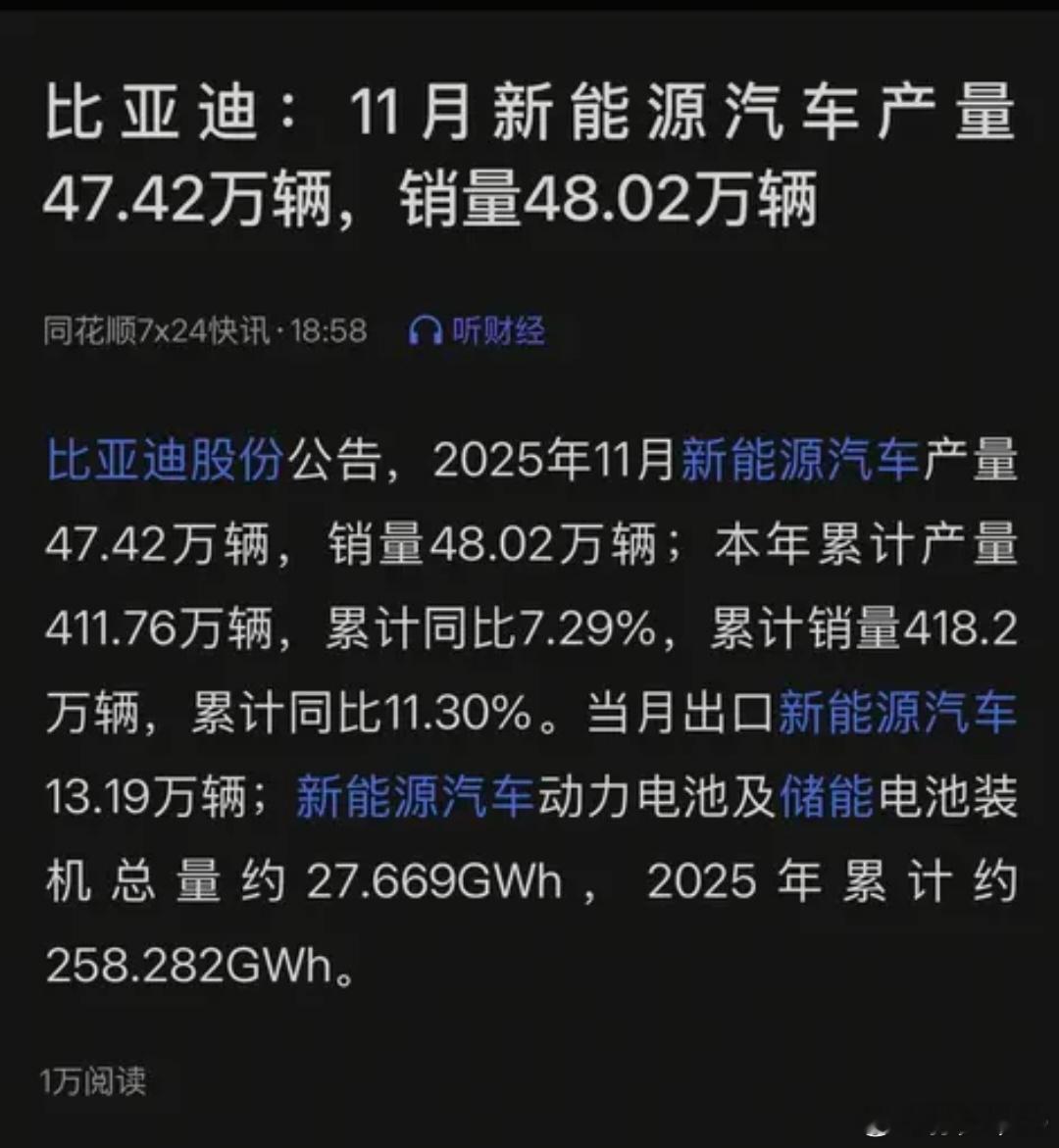 比亚迪11月产量47.42万辆,销量48.02万辆,其中出口13.19万辆11月的销量基本都发了,大家感觉怎么样