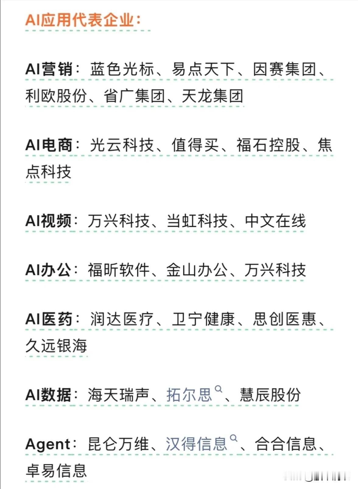 AI应用产业生态全景:多元场景赋能下的创新赛道解析 人工智能技术正深度融入千行百业,催生出丰富多元的应用生态。从营销、电商到视频、办公,再到医药、数据与智能体(Agent)领域,AI已成为推动产业升级的关键驱动力。 在具体场景上,AI营销已实现精准投放与内容生成,为企业提升转化效率;AI电商借助推荐算法与智能客服优化消费体验;AI视频工具大幅降低创作门槛,赋能内容创新;AI办公则聚焦文档处理与流程自动化,提升协同效能。与此同时,AI医药在辅助诊断、药物研发等领域展现出重要潜力;AI数据服务为模型训练提供高质量语料与处理支持;而智能体(Agent)作为新兴方向,正推动人机交互向自主化、智能化演进。 当前市场对AI应用持续保持高度关注,各细分板块交替活跃,反映出行业正处于高速成长期。随着技术迭代与商业化场景不断拓展,AI已逐步从概念走向落地,未来在垂直行业的渗透有望进一步加深。尽管部分领域尚处早期,但长期来看,具备真实需求、数据积累与场景理解能力的企业更可能构建持续竞争力。整体产业发展将更趋务实,技术融合与生态协作将成为演进主线。 AI发展动向 AI市场分析 AI 行业分析 AI发展战略 AI行业 AI产业机会 ai行业报告 AI发展策略 股票知识 股市分析