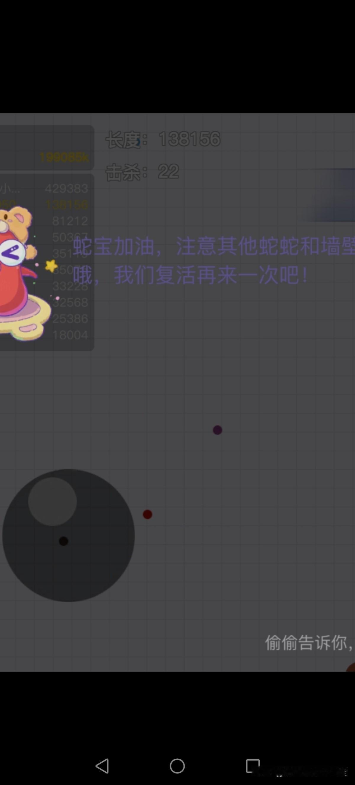 我就截个屏什么也没干,然后,然后就撞到其他蛇蛇了,就挂了[流泪][流泪]不然玩到50万应该是没问题的,唉!可惜呀!可惜运气差了点,还是差了点[捂脸][捂脸]