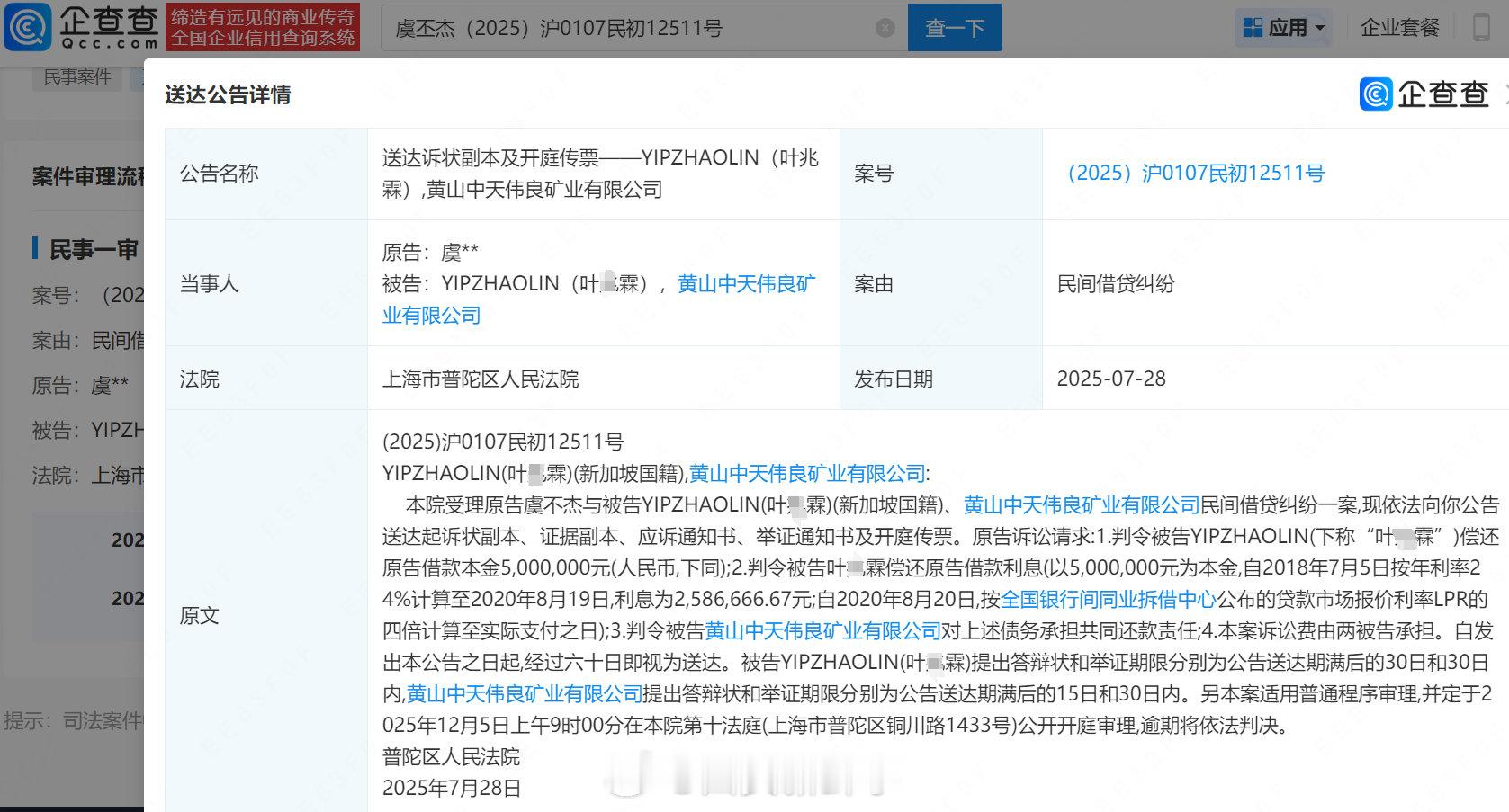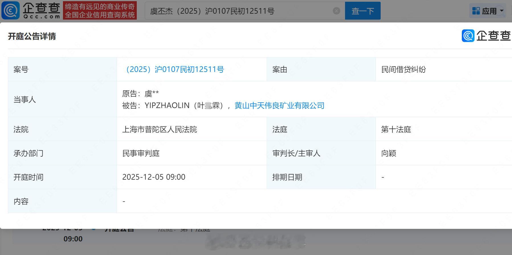 【虞书欣父亲借贷纠纷即将开庭】虞丕杰起诉索要借贷本息758万企查查APP显示,近日法院公告虞书欣父亲诉叶某霖、黄山中天伟良矿业有限公司民间借贷纠纷案进展,该案将于12月5日9时在上海市普陀区人民法院开庭审理。今年7月,虞丕杰曾起诉要求两被告偿还500万借款本金及258.66万余元利息。