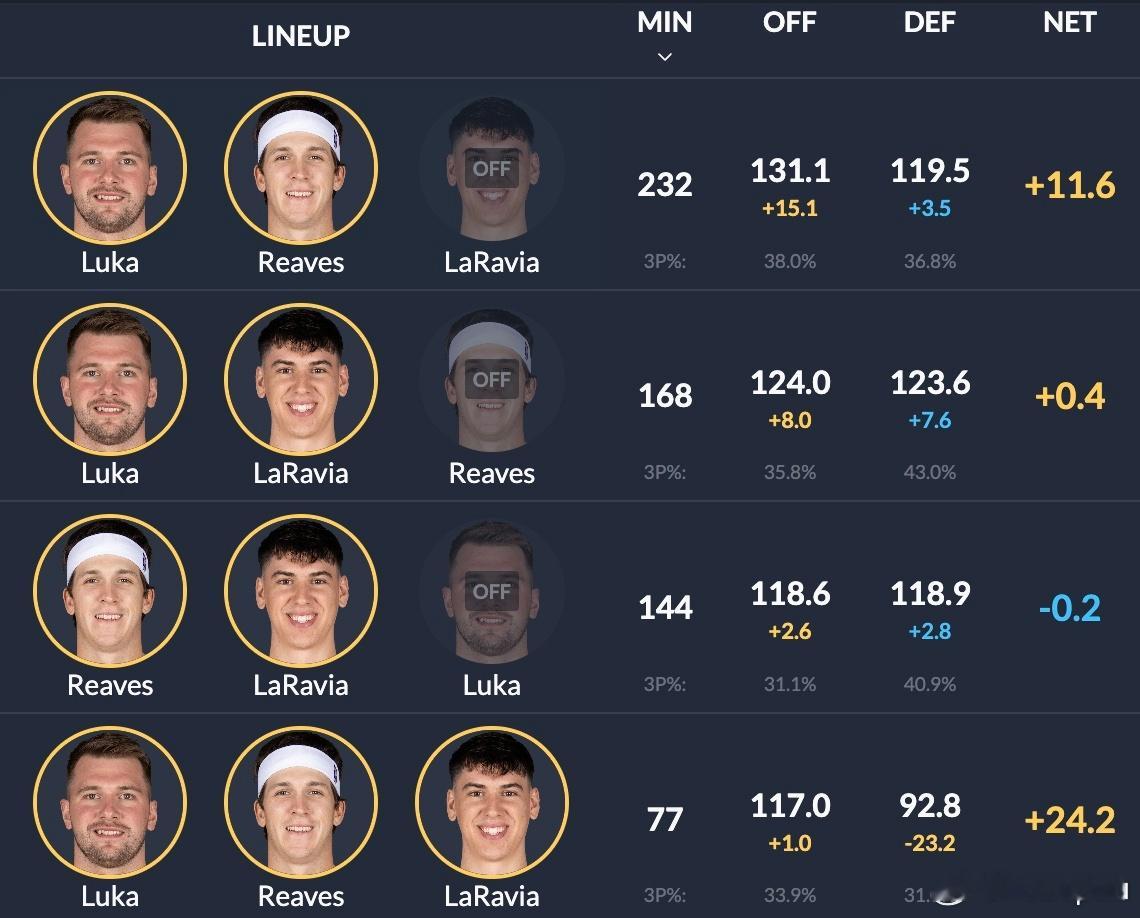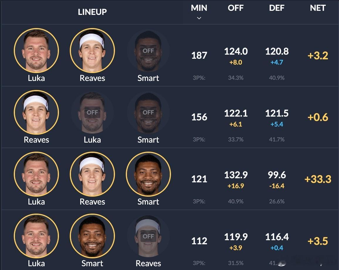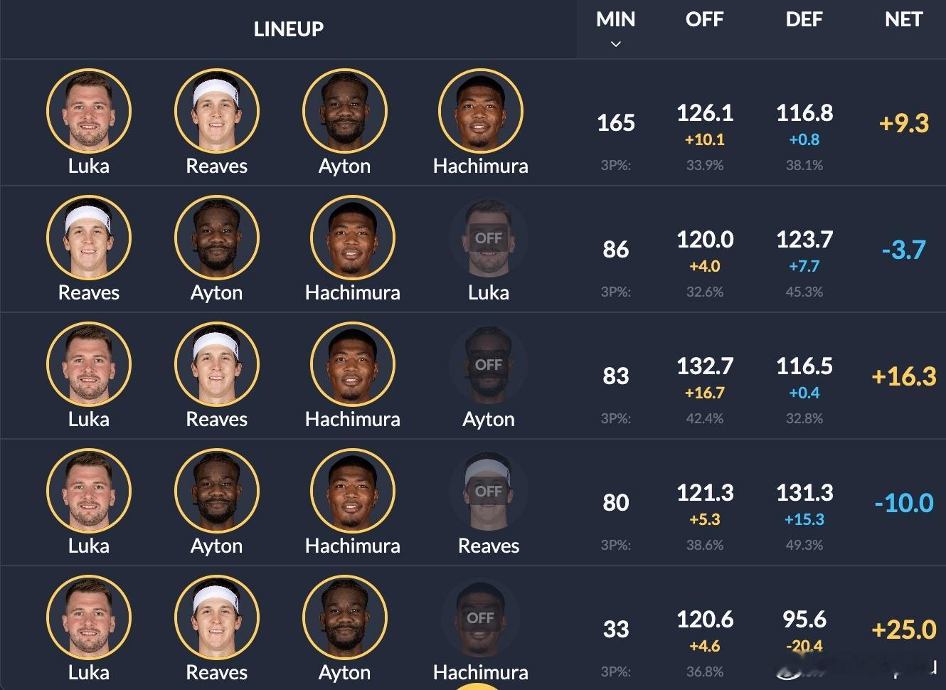 接下来的三个客场,猛龙、凯尔特人和76人,包括一个背靠背,将检验球队成色。输没问题,但得打出点心气,就像赛季初伤病那么多时还能拼下硬仗一样。20场打完也能做个小总结。之前我写过正负值不是一个有用的数据,那指的是单场正负值。正负值最有效的用法就是看不同组合的数值,由此判断不同组合是否有效。图1:077+里弗斯+艾顿+八村四人组,以及减掉其中一人后的正负值,印证了之前我说的艾顿和八村同时在场的防守问题。图2:077和里弗斯的双人组,极高的效率。图3:077+里弗斯+八村+海斯的四人组,八村明显更适合与海斯搭档内线。图4:077+里弗斯+拉拉维亚三人组,三人同时在场时间较少,但效率很高,但意外的是里弗斯单搭拉拉维亚是负的。图5:077+里弗斯+斯玛特三人组,同时在场的效率非常高。图6:077+里弗斯+八村三人组,三人同时在场时有着很好的进攻效率。